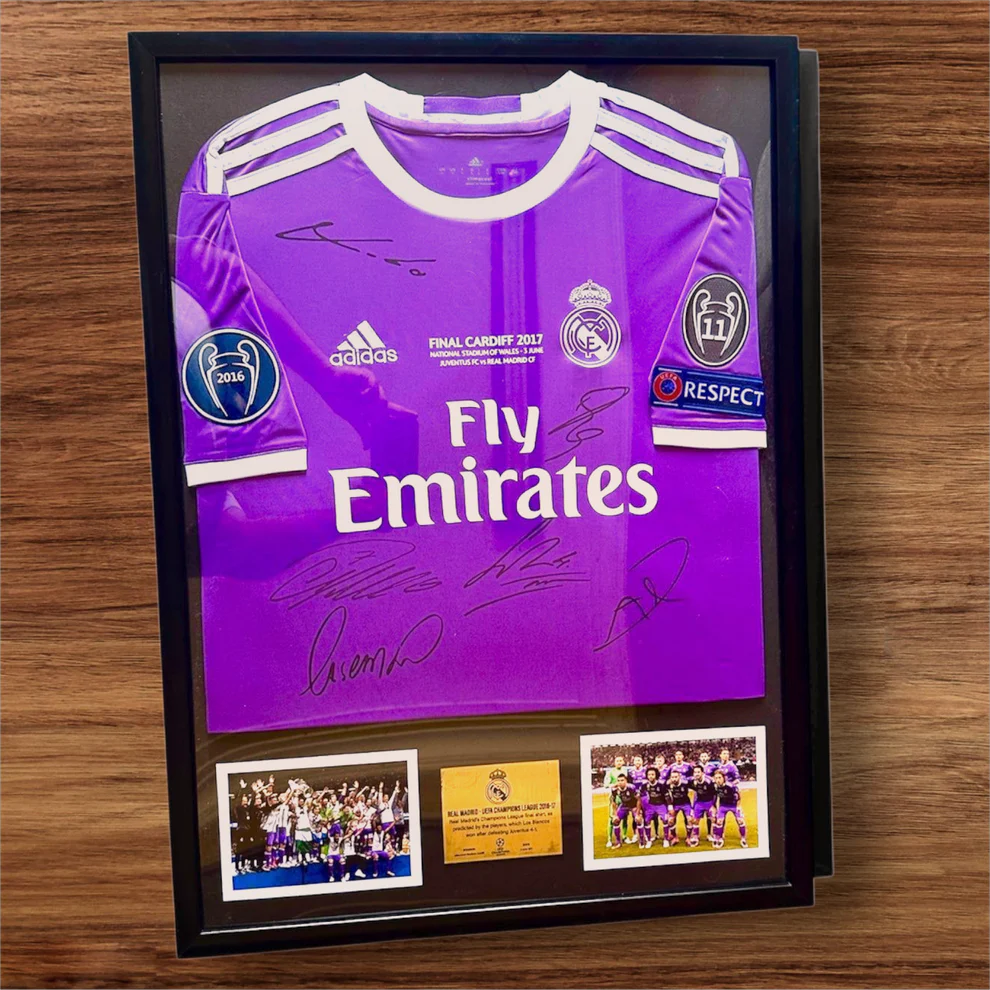 Celebrate Real Madrid’s historic 2017 UEFA Champions League Final victory in Cardiff with this stunning framed collectible jersey. Featuring high-quality printed autographs of the Madrid players, this piece is designed to look just like the signed originals—at a very affordable price compared to hand-signed versions.