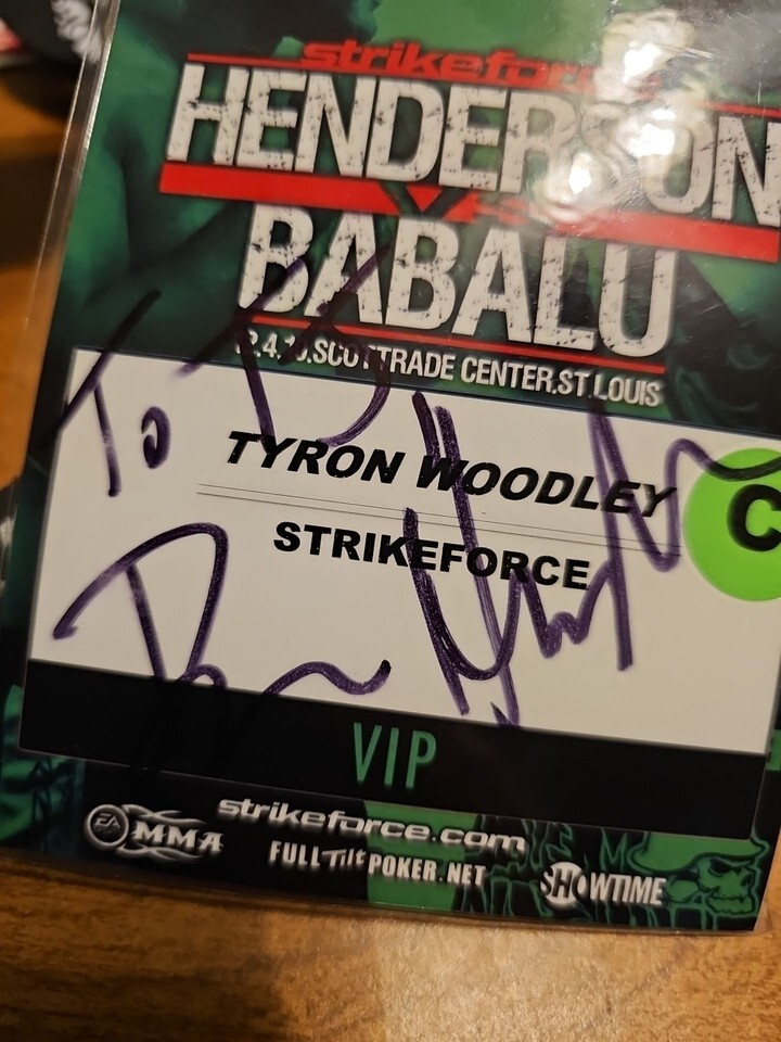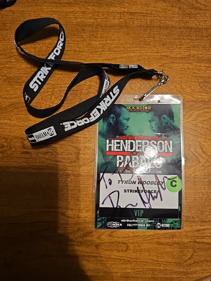 The product is a signed VIP pass for the Henderson Vs Babalu fight featuring Dan Henderson in the Strikeforce League of Mixed Martial Arts (MMA). The signature is original, indicating it was signed by Dan Henderson himself. This product was acquired from Tyron Woodley's gym after it closed down.