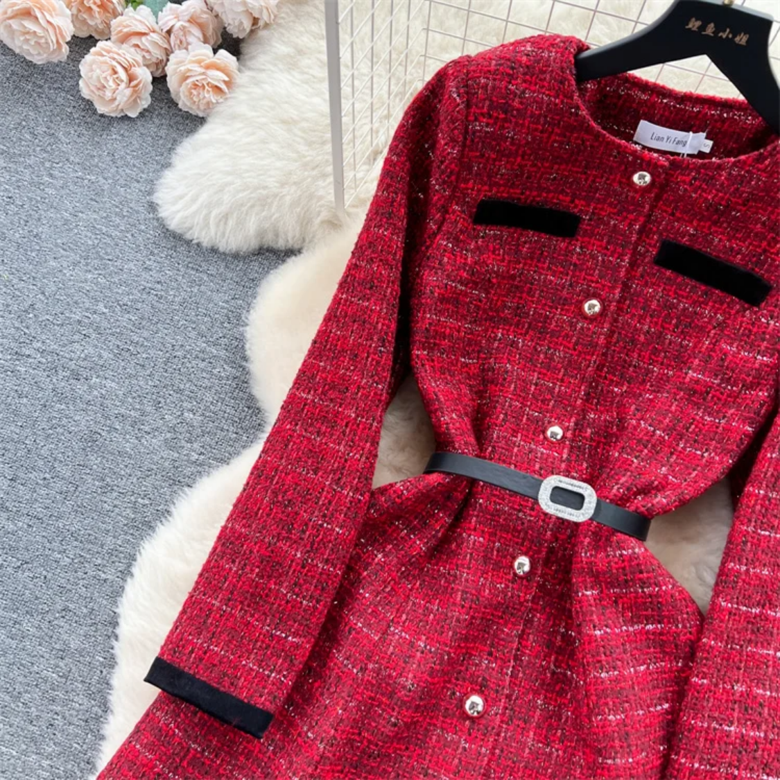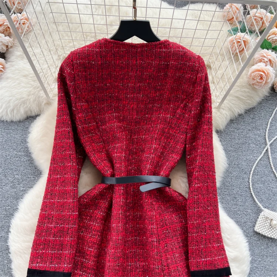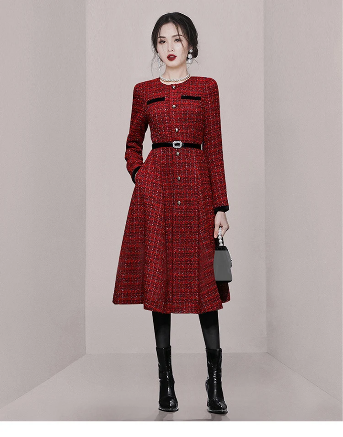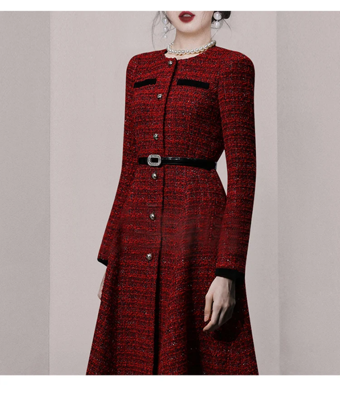 - Autumn And Winter New Luxury Style Wine Red Tweed Midi Dress