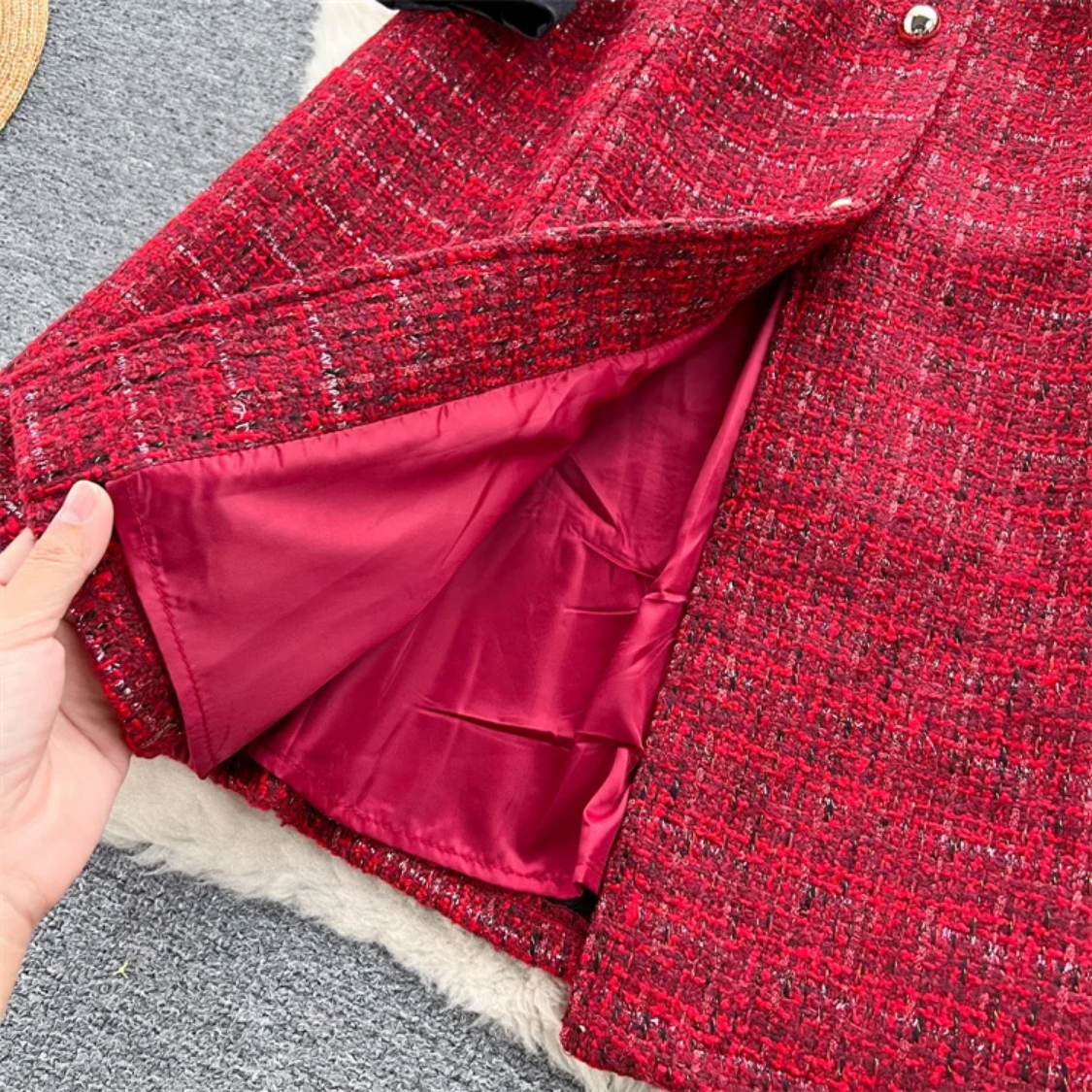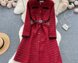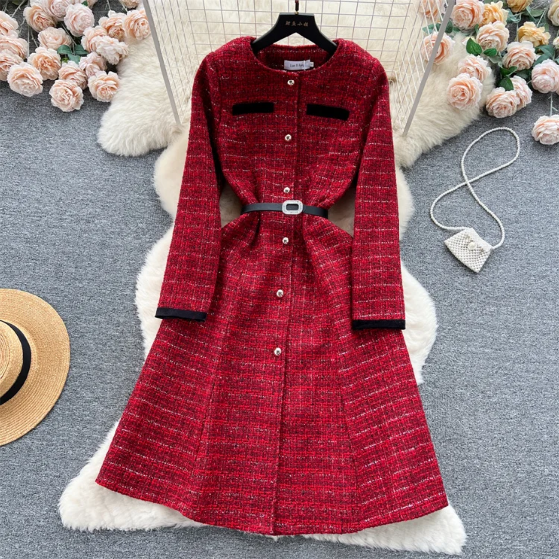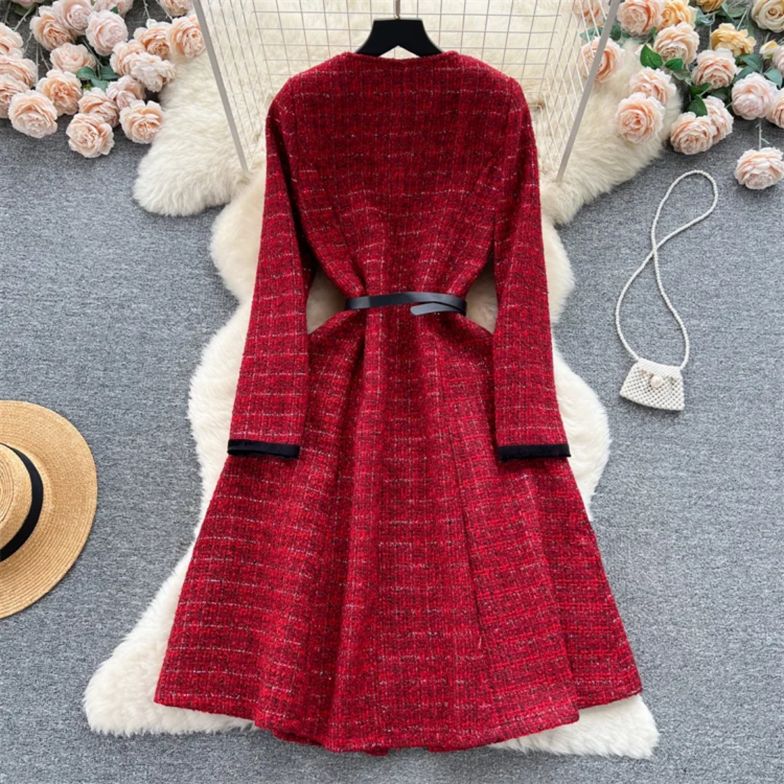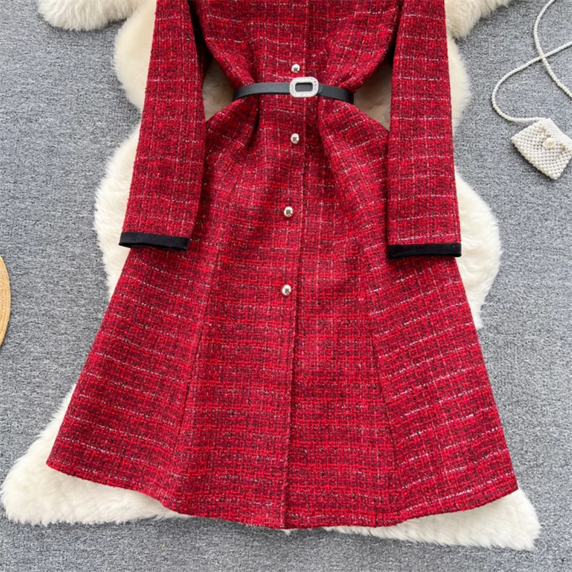 - Autumn And Winter New Luxury Style Wine Red Tweed Midi Dress