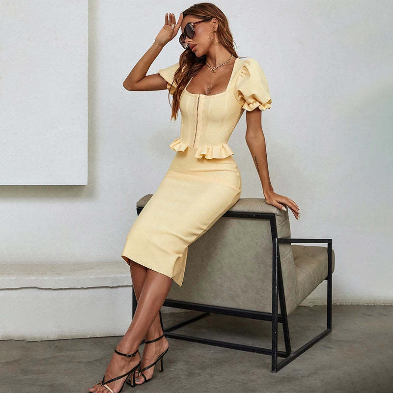 Autumn Sexy Short Sleeve Zipper Yellow Midi Bodycon Bandage Dress