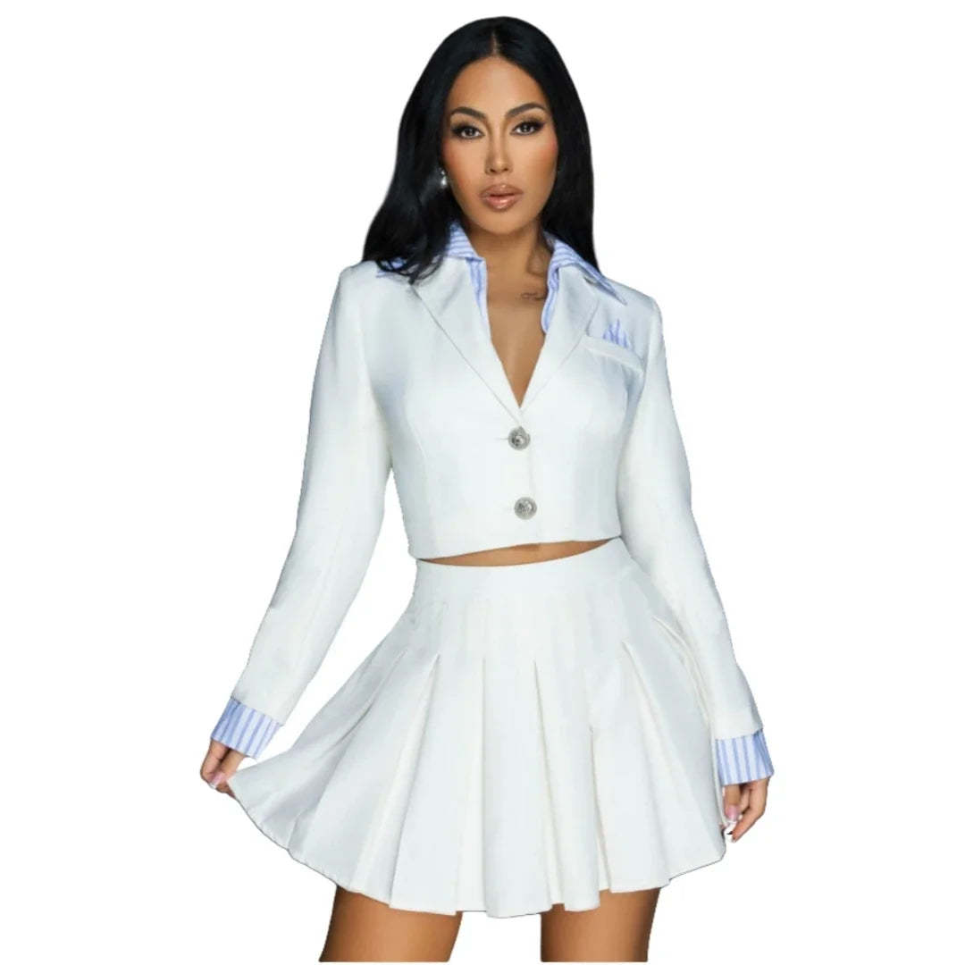 - Autumn Stripe Patchwork Buttons Cropped Blazer and Mini Skirts