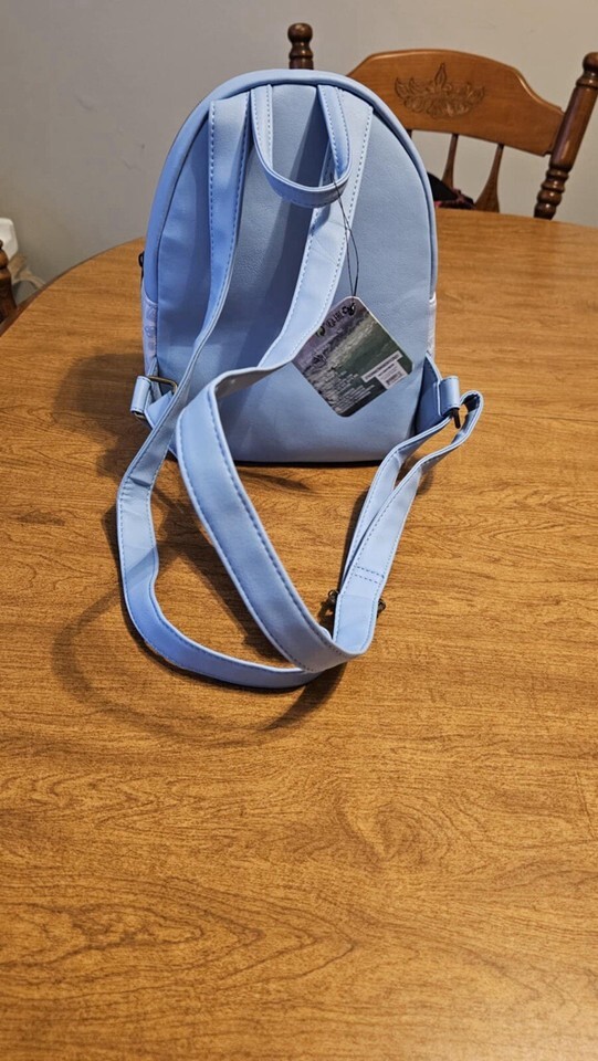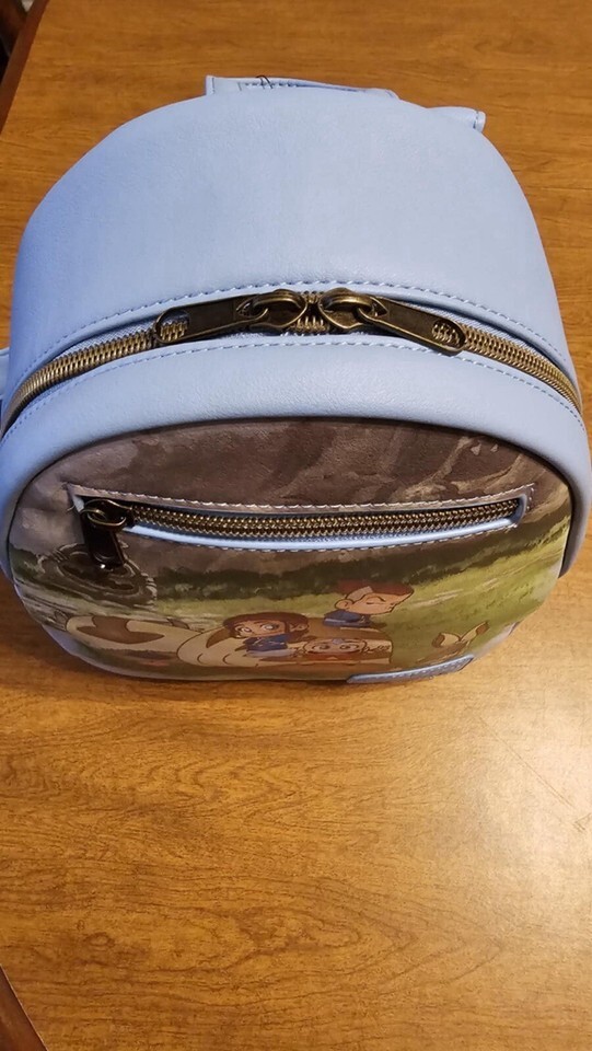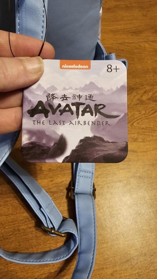 This is a Loungefly backpack featuring chibi versions of characters from Avatar The Last Airbender, including Aang, Sokka, and Appa. The mini-sized backpack is made of light blue faux leather with blue handle/strap accents. It has a zip closure, inner pockets, adjustable strap, and pockets on the exterior. Perfect for fans of the Nickelodeon show!
