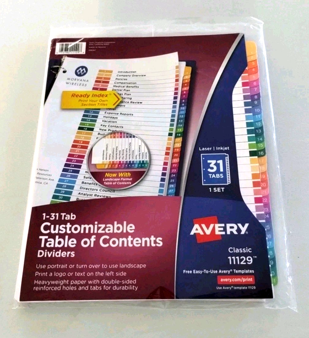 - Avery Customizable Table of Contents Dividers 1-31 Tabs Classic (11129)- New