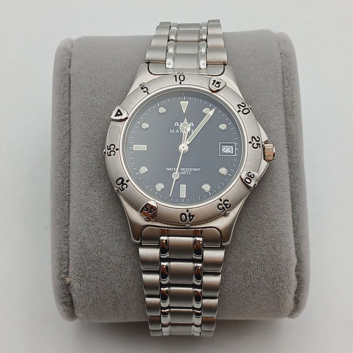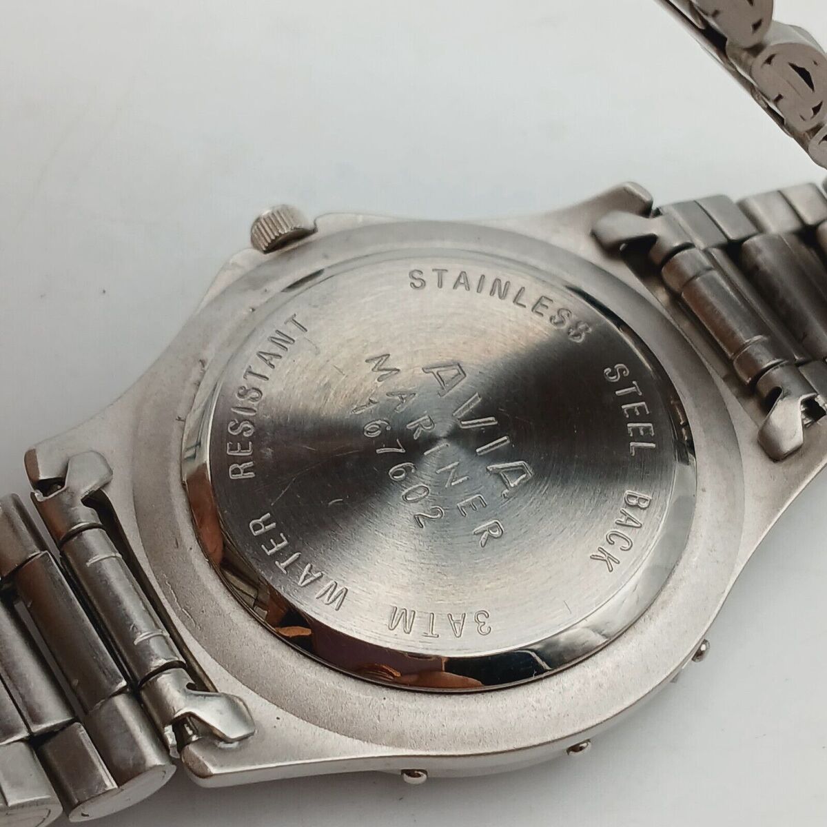 This Avia Mariner wristwatch is a vintage timepiece with a round, silver-tone metal case and a black dial with stick indexes. It features a one-piece strap and a screwback caseback. This watch has a quartz movement, a date indicator, and a 12-hour dial. It is not water-resistant and does not come with papers, service records, or the original box/packaging.
