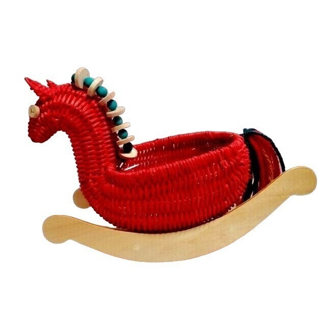 Made of wicker with wood beads for eyes, mane and the rocker, and yarn for the tail. Also has a plastic liner for candy, nuts, or trinkets.