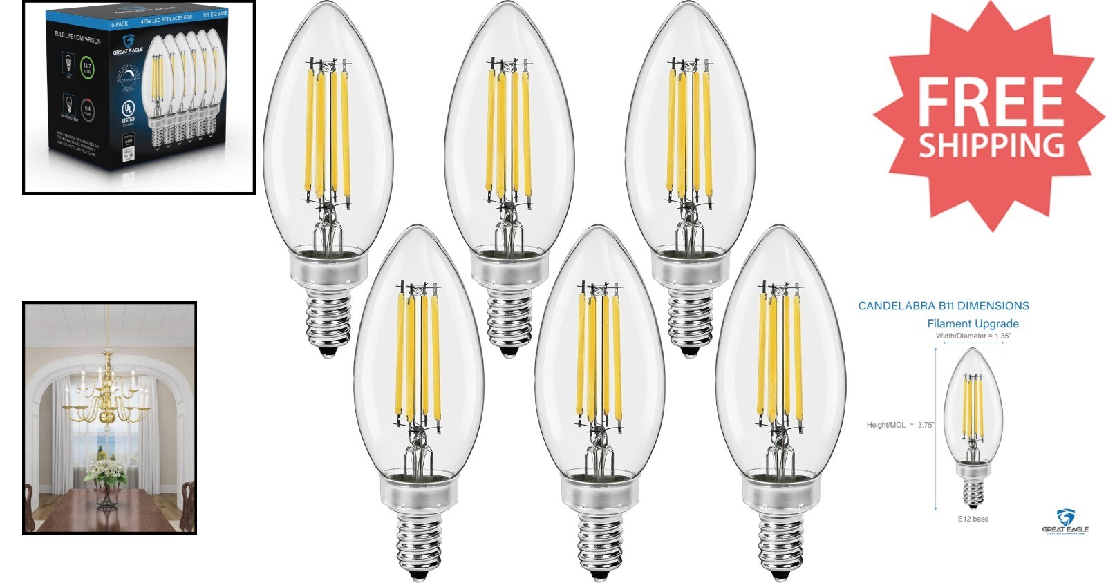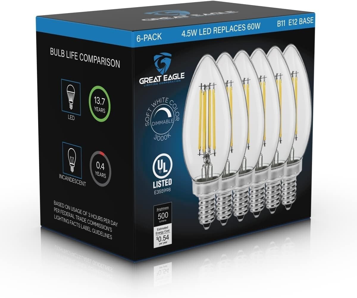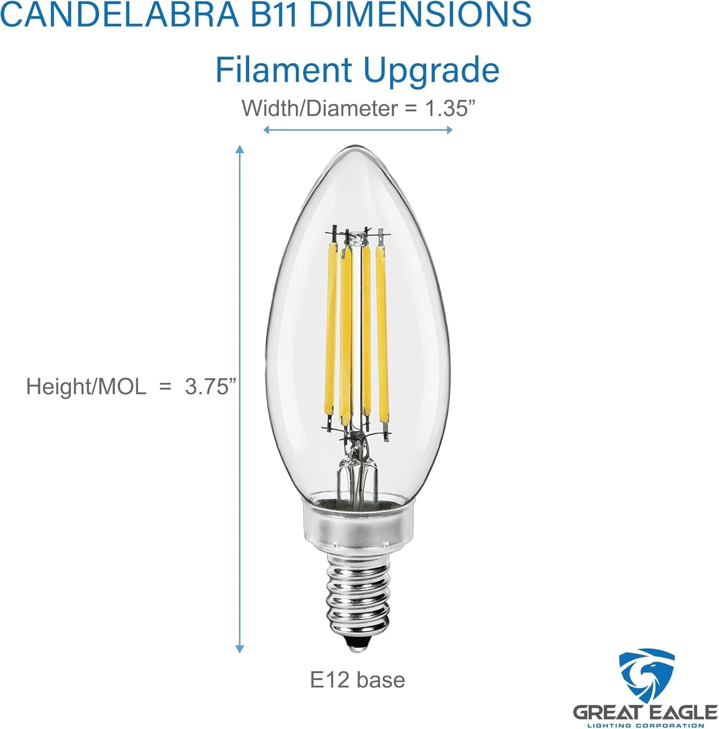 Elevate your lighting with the Top Rated Listed Dimmable Candelabra B11 Filament Globe LED Light Bulb. Perfect for chandeliers, lanterns, sconces, string lights, and decorative fixtures, this full-featured LED combines energy savings with a luxurious aesthetic. With only 4.5W, it replaces a 60W bulb?saving over 90% on energy costs?while providing instant illumination and a high CRI of 83+ for true, vibrant colors. Designed for visible bulb applications, its vintage-style filament and clear glass give you versatile romantic or modern looks. Reliable and proudly supported from the USA, Great Eagle stands behind quality and customer satisfaction.