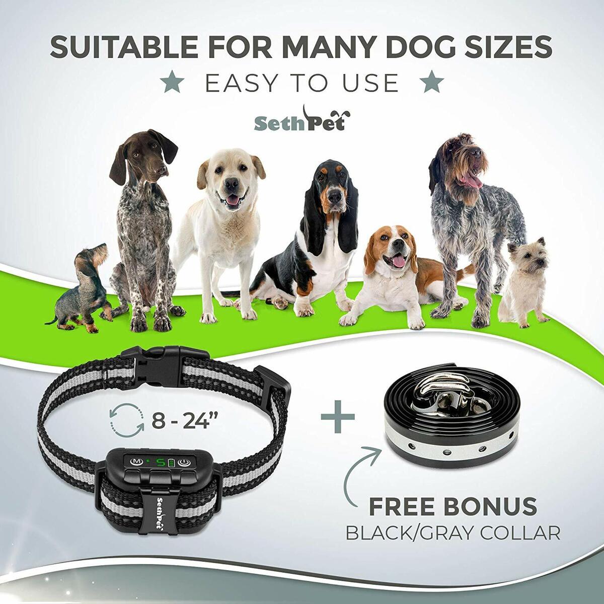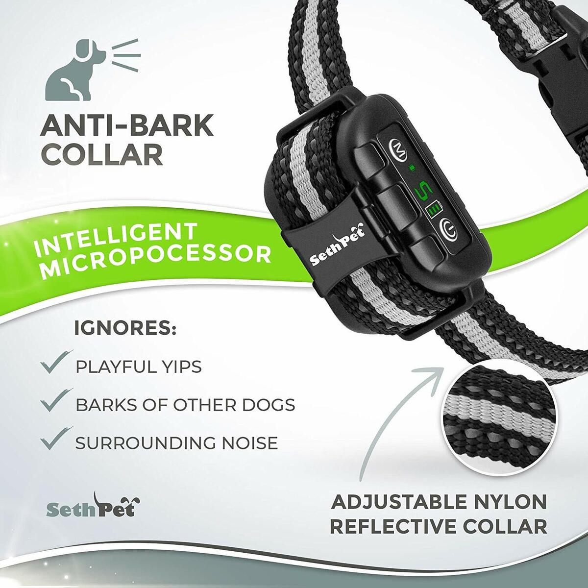 INTELLIGENT ANTI-BARK COLLAR: SethPet?s Bark Collar is the smart and humane way to bark train your dog. Waiting to correct until barks reach 1000-2000kHZ, 80-90db, our intelligent microprocessor ignores playful yips, barks of other dogs, or surrounding noise. The adjustable nylon reflective collar fits dog?s necks from 8 - 24 inches and is available in Fluorescent Yellow, Gray, and Black color varieties.