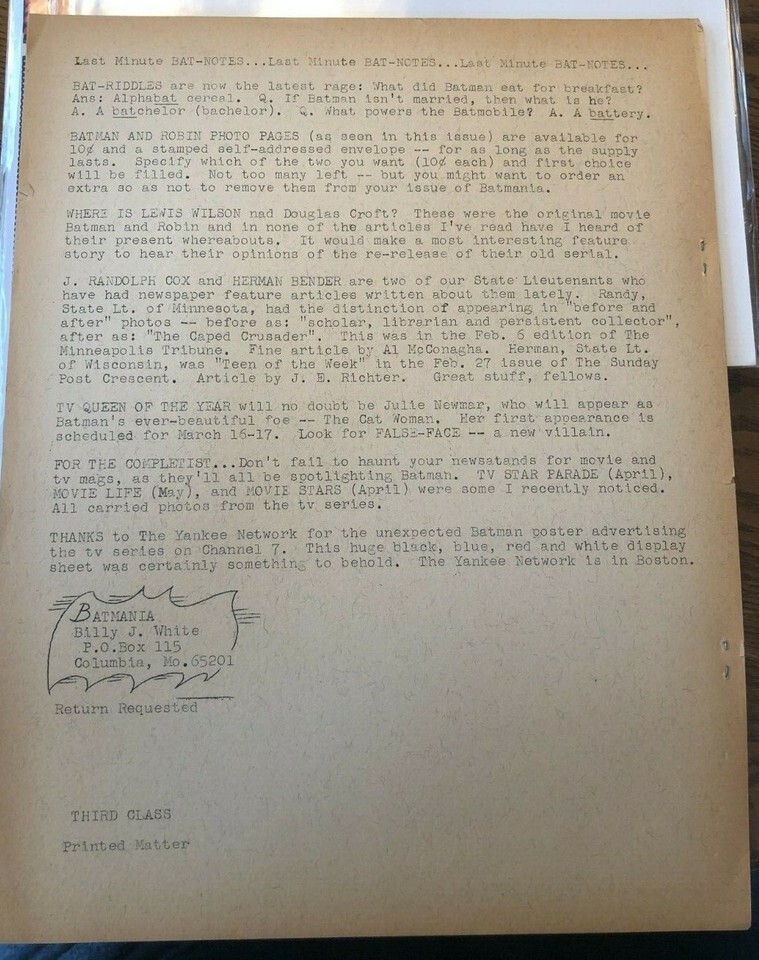 - BATMANIA #10 vintage Biljo White comic fanzine (1966) Batman & Robin photos VG++