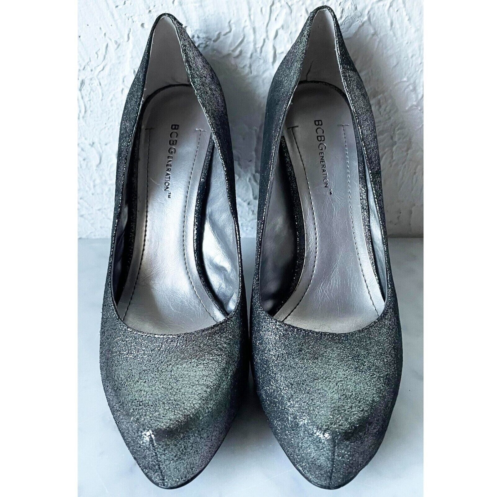 BCBGeneration women's size 8.5M/38.5 platform pumps are in excellent condition with very little wear. Sparkly gold black iridescent leather upper. Stiletto heel and padded insole. Textured area on sole.