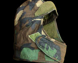 The MILITARY "Pile Cap" features a green woodland camouflage BDU pattern on the outside features an adjustable hook and loop closure at the bottom which covers the mouth neck region a small bill (forehead flap) at the top. As well, the inside top of the cap fitted with 2 label tags with the first reading "Cap, Cold Weather, Insulating, Helmet Liner"