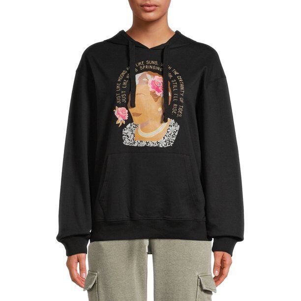Black History Month Maya Still I Rise ladies young adult graphic hooded pullover sweatshirt. Soft fleece fabrication to provide a comfy relaxed fit paired with inspirational graphic design of Maya. Silhouette has a kangaroo pocket and rib cuffs, waistband.