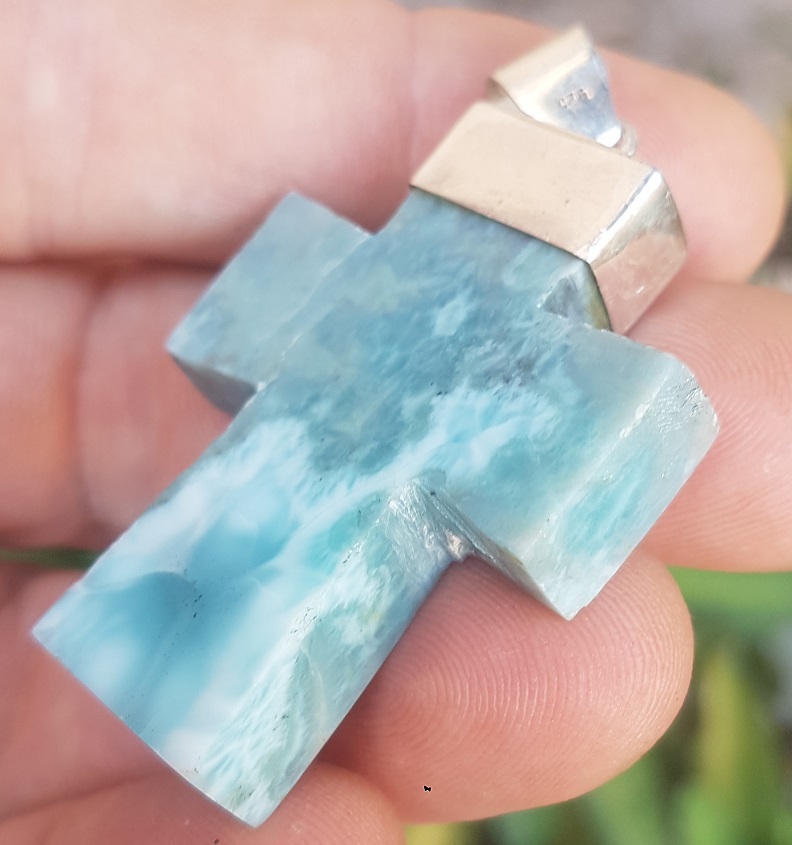 - BLUE larimar handcarved CROSS 925 sterling silver Gemstone pendant (jor-154)