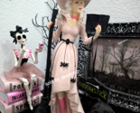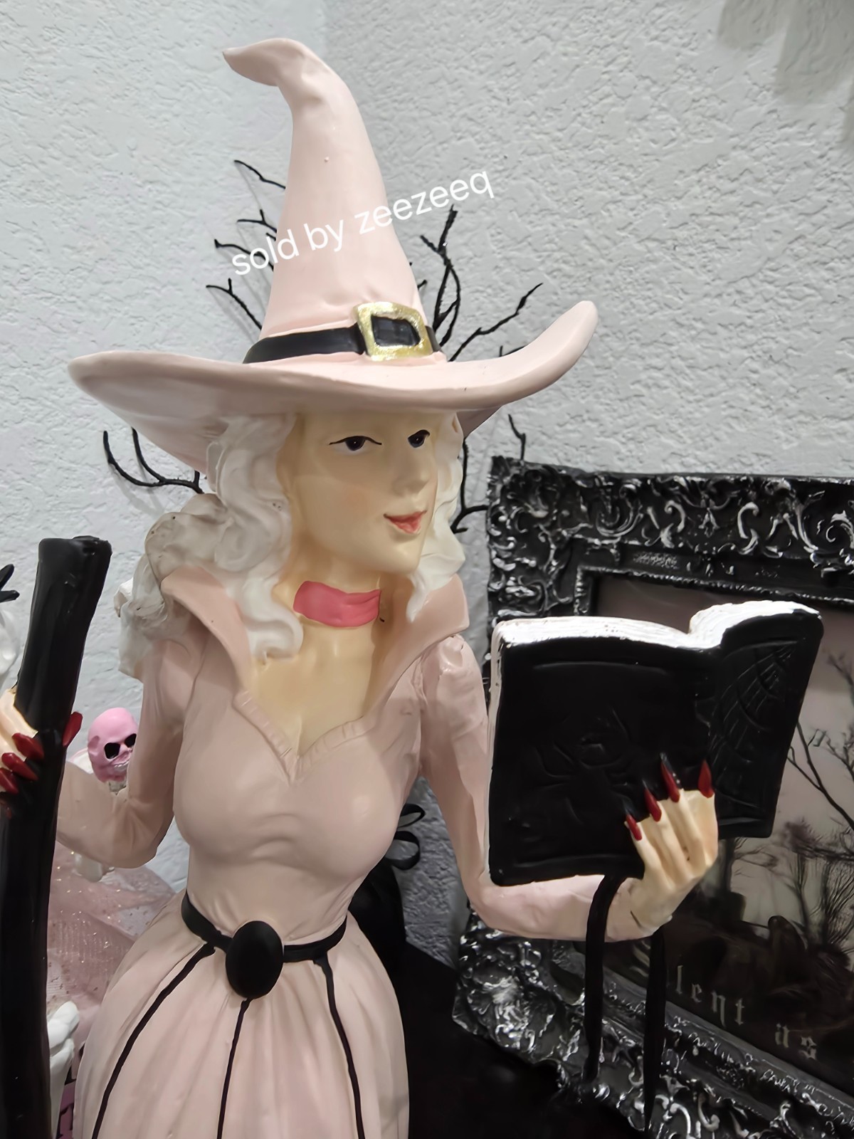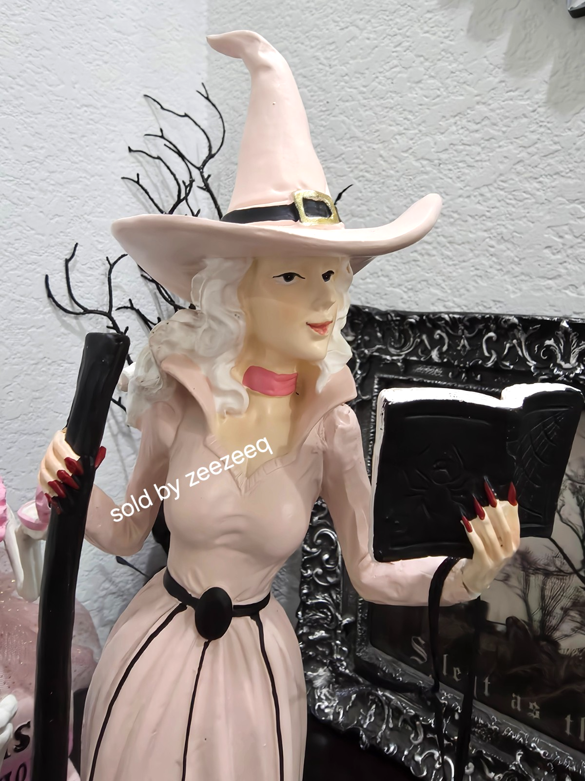 Up for sale we have this adorable witch for your Halloween decor. She is holding her spellbook in one hand and a broom on the other. Her dress is pink with black spiders and wears a matching pink witch hat. She is too cute!! She stands approx 15" tall. Made of resin. NEW