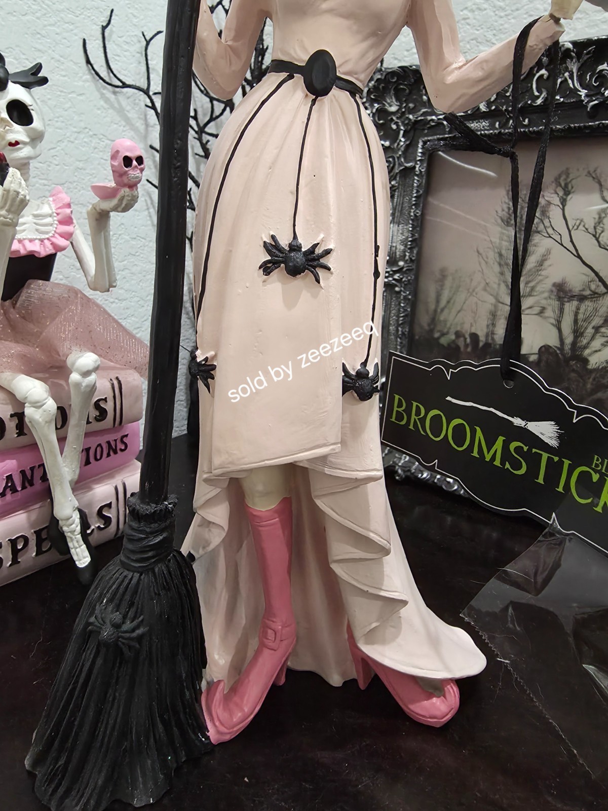 BROOMSTICK Halloween Stunning 15" Witch Figurine Pink Dress & Spiders