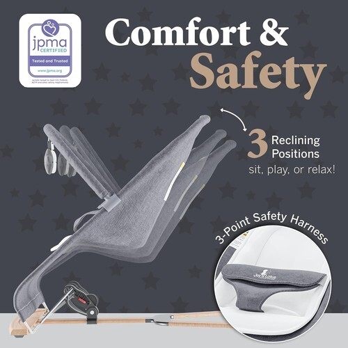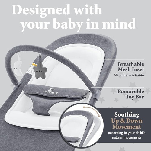 SAFETY MEETS STYLE MEETS FUN Because safety is paramount in every Joy Lotus design, our bouncers are JMPA certified and feature a secure 3-point harness, ensuring babies stay safe and securely positioned. The ergonomic structure delivers comfy support for baby's head, neck, and back. A removable toy bar with two soft toys adds an element of fuzzy fun to baby's lounging time and provides plenty of entertainment and distraction while mom dad take care of other things around the home. The cushion cover and breathable mesh insert can both be easily removed for machine washing, ensuring consistent hygiene and comfort levels.