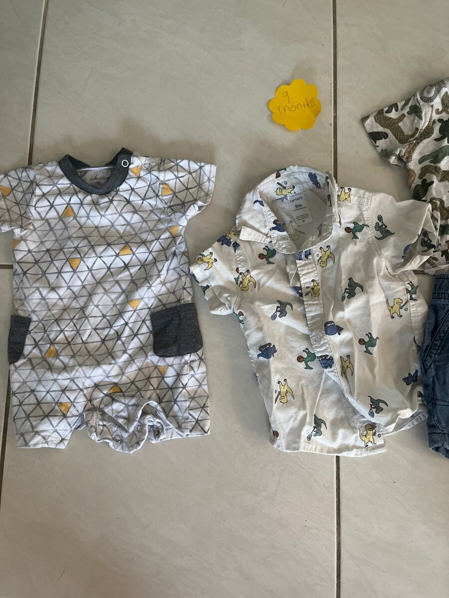 - Baby Boy 9M Bundle 5 pcs • Romper, Tee, Dino Sleeper, Denim Shorts • Free Ship