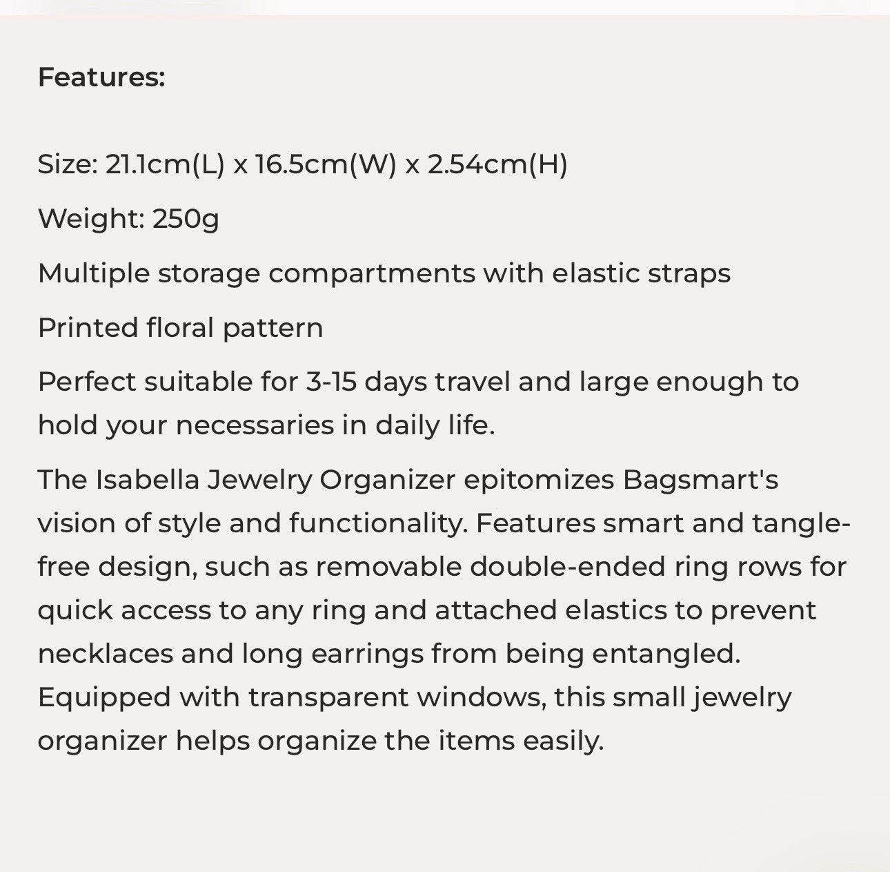 The Isabella Jewelry Organizer epitomizes Bagsmart's vision of style and functionality. Features smart and tangle-free design, such as removable double-ended ring rows for quick access to any ring and attached elastics to prevent necklaces and long earrings from being entangled. Equipped with transparent windows, this small jewelry organizer helps organize the items easily.