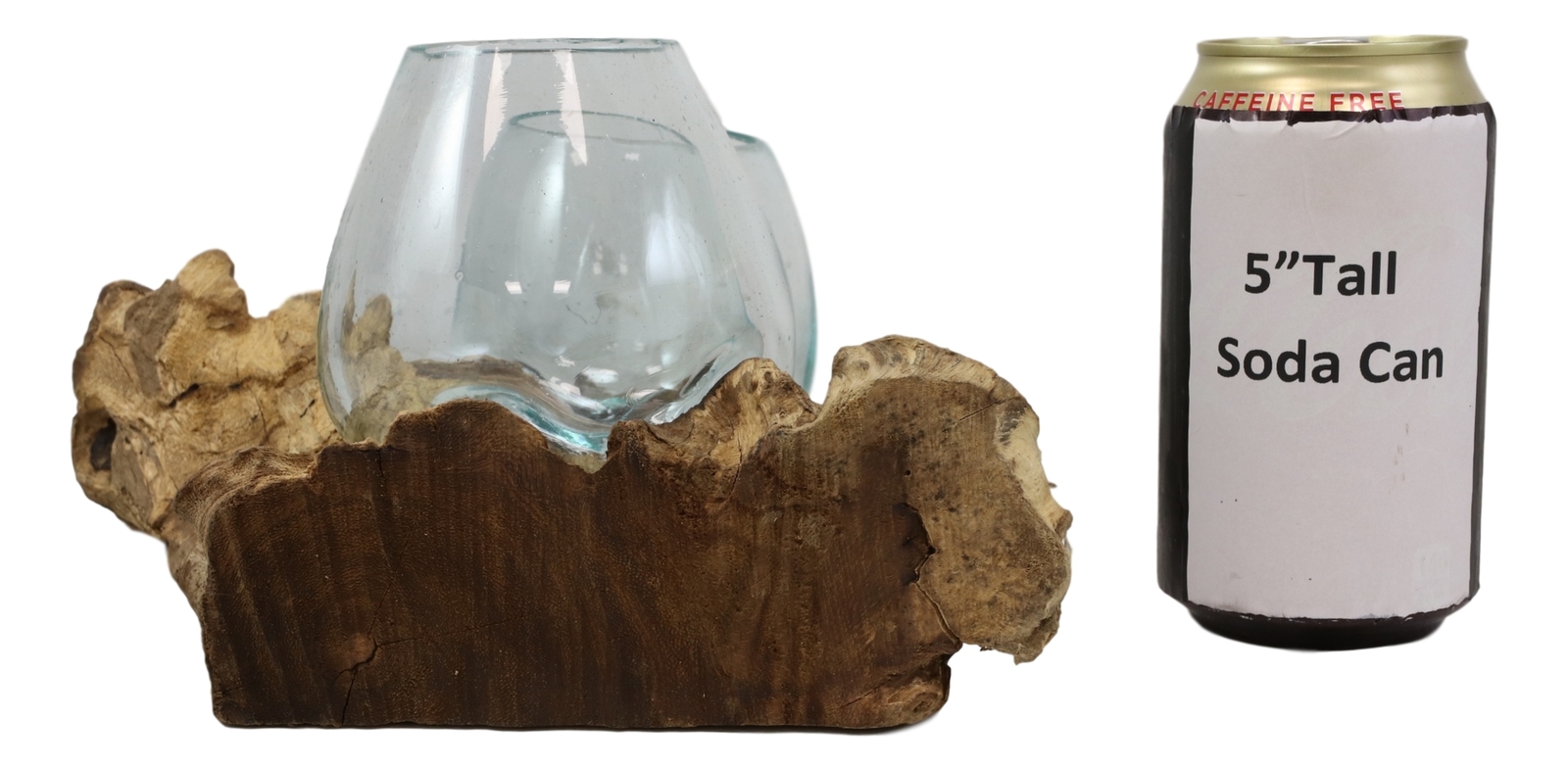? Each Hand Blown Glass measures approximately 3.25" High, 4.25" Wide and 4" Deep overall. The natural Gamal hardwood driftwood base alone is about 3.25" High, 12.5" wide and 9" Deep. The glass has a 11 fluid ounce capacity.