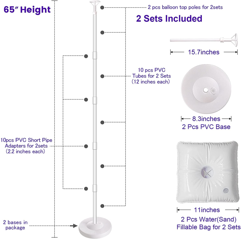 ???? Package Includes: 2 PVC Bases, 10 long pipes, 10 short pipe adapters, 2 PVC base pipes, 2 pcs water(sand) fillable bags, 2 top balloon poles, 30 balloon clips, 2 balloon knotters, 2 flower clips,1 dot glue.