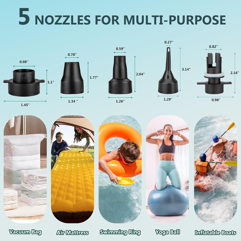 Versatility with 5 Nozzles: With five included nozzles, the Voircoloriaair pump accommodates a wide range of inflation and deflation tasks. It seamlessly works with inflatable boats, rafts, air mattresses, airbeds, pool floats, inflatable pools, pool toys, swimming rings, yoga balls, and vacuum storage bags, ensuring versatile functionality