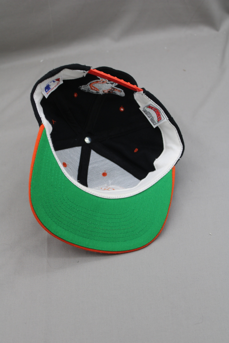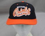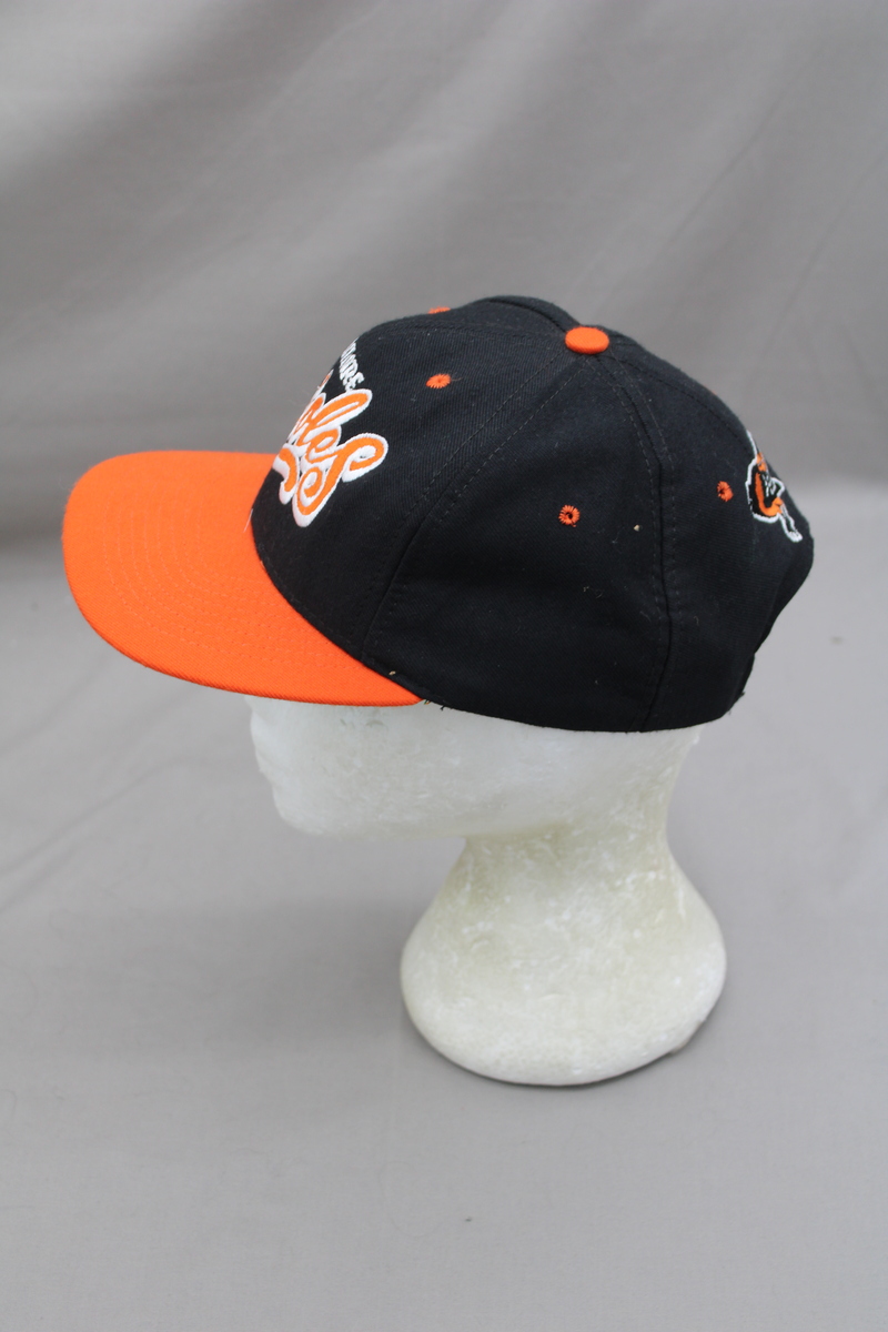 Up for sale is a vintage Baltimore Orioles hat by Nutmeg. It has a black base colour with an orange brim. The front of the hat has Baltimore Orioles stitched in wavy script. 'The back of the hat has the Orioles logo stitched in above the snapback. What a great hat do not miss out on it.