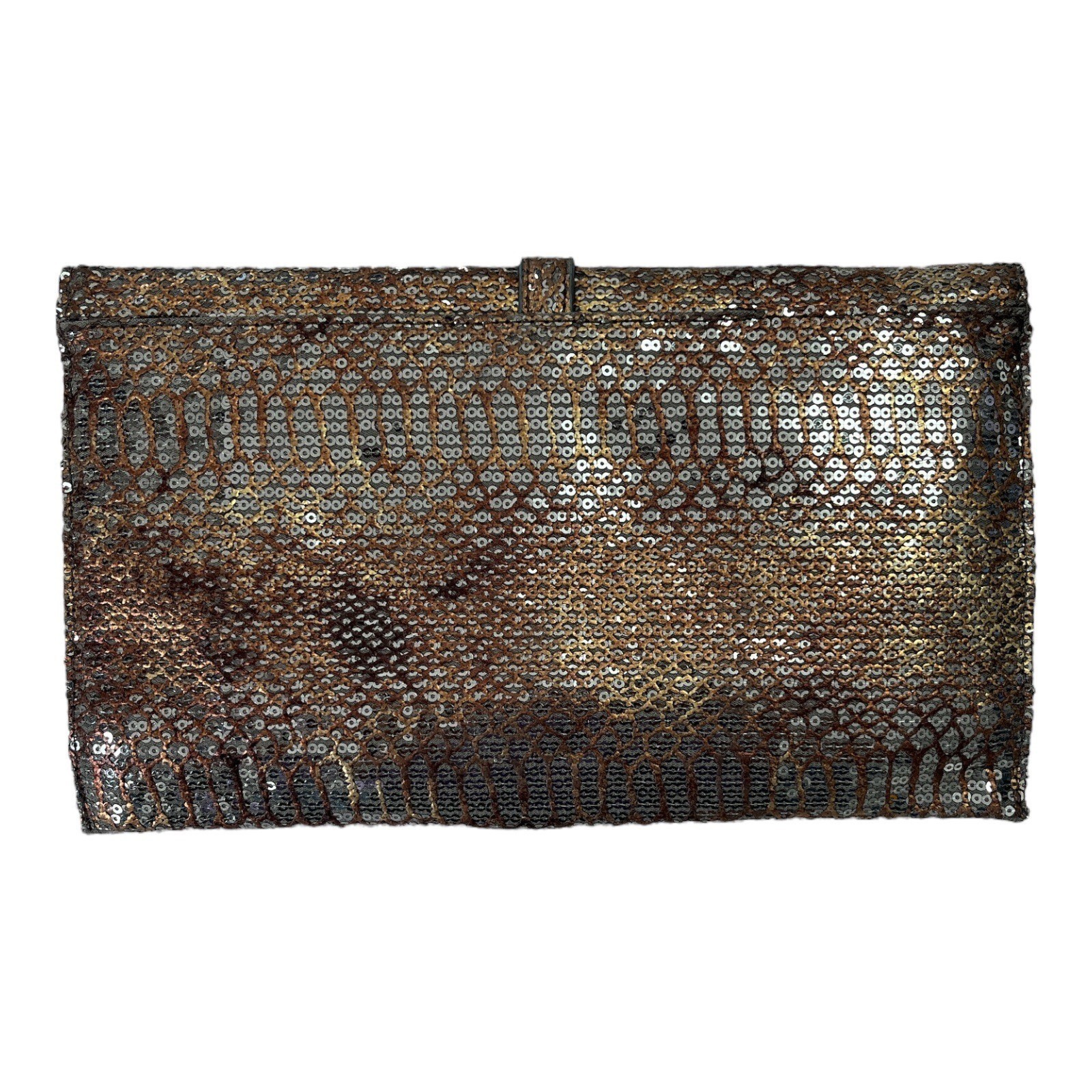 Chic early 2000s Bangles Bags clutch featuring a metallic sequin design in shimmering bronze, gold, and silver tones. The foldover silhouette is accented with a slim strap and gold-tone hardware, secured by a magnetic snap closure. Fully lined in smooth satin with an interior zip pocket and side D-rings for an optional strap. A perfect Y2K-era statement piece for parties, weddings, or evening wear.