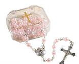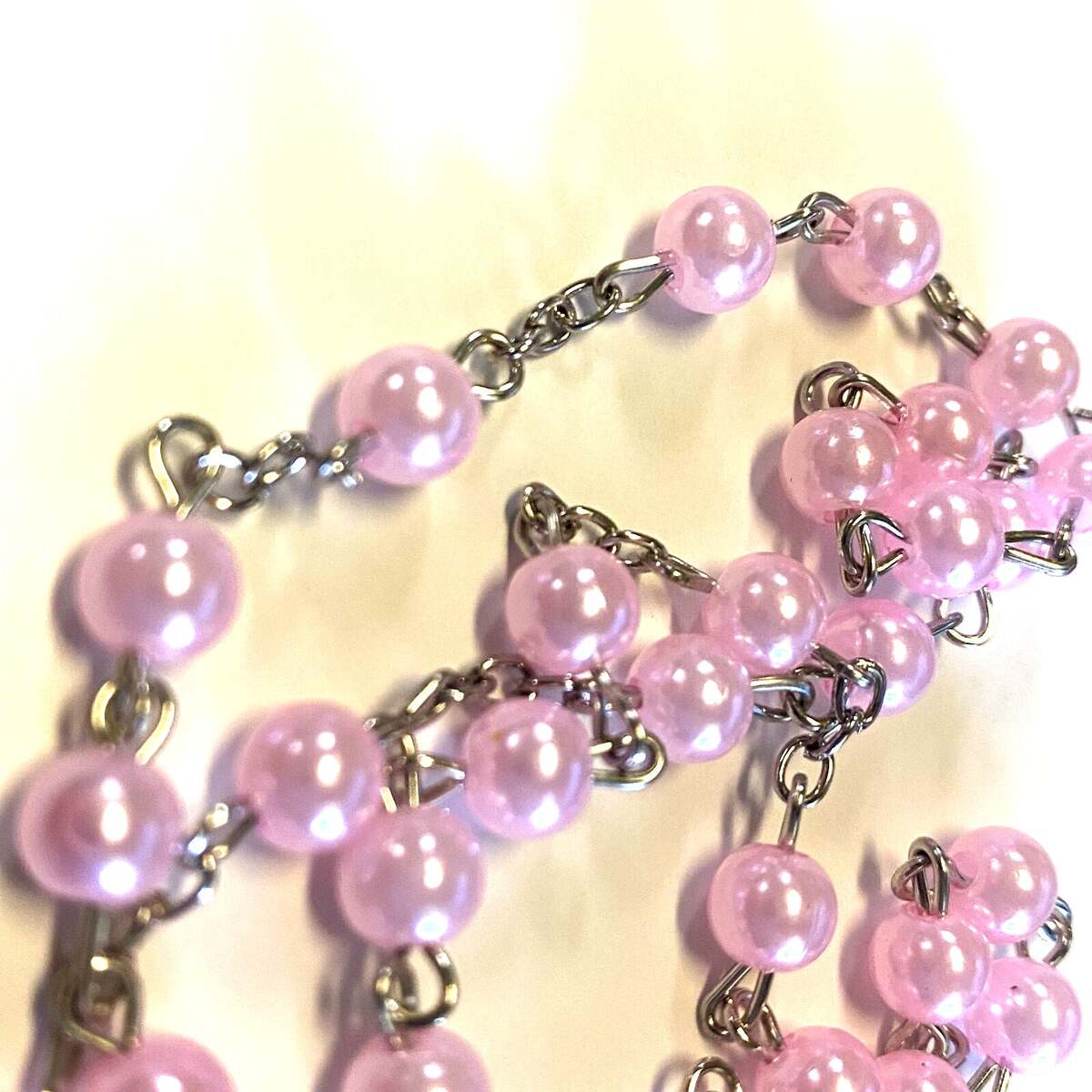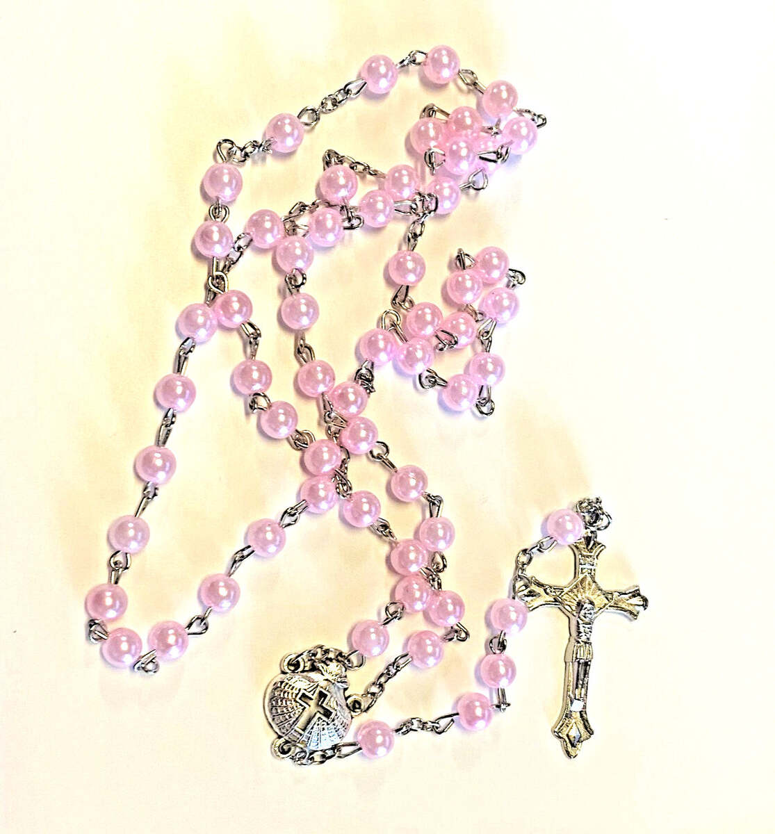 You are purchasing a beautiful pink rosary with imitation pearls beads.