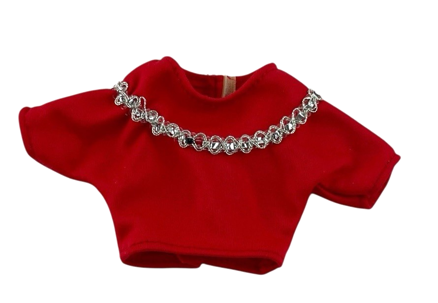 Red dolman style top with silver sequin thread neck embellishment to create bling.
