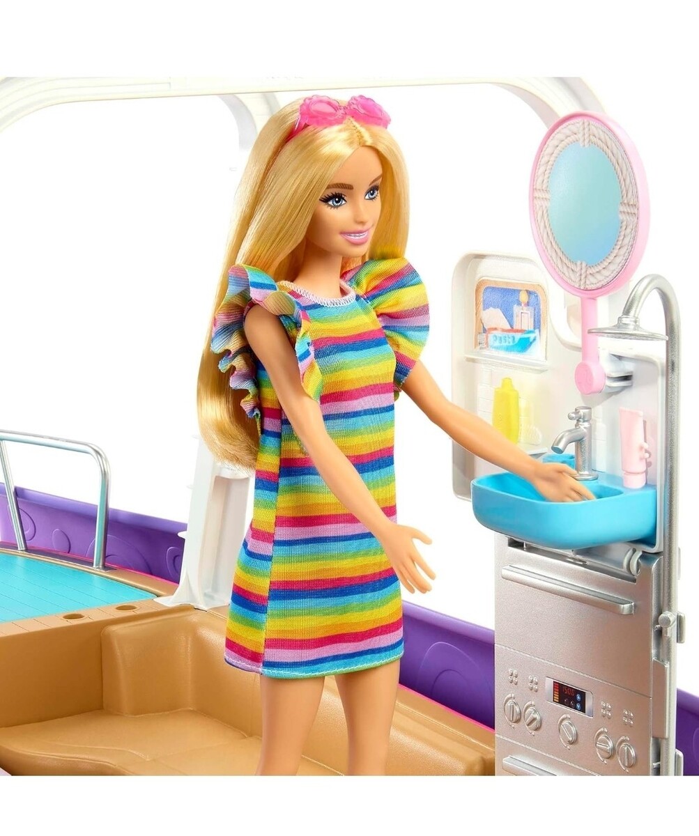 Make waves with the Barbie Dream Boat. This playset is decked out with premium details like a pool, slide, two different transformations, and so much more.