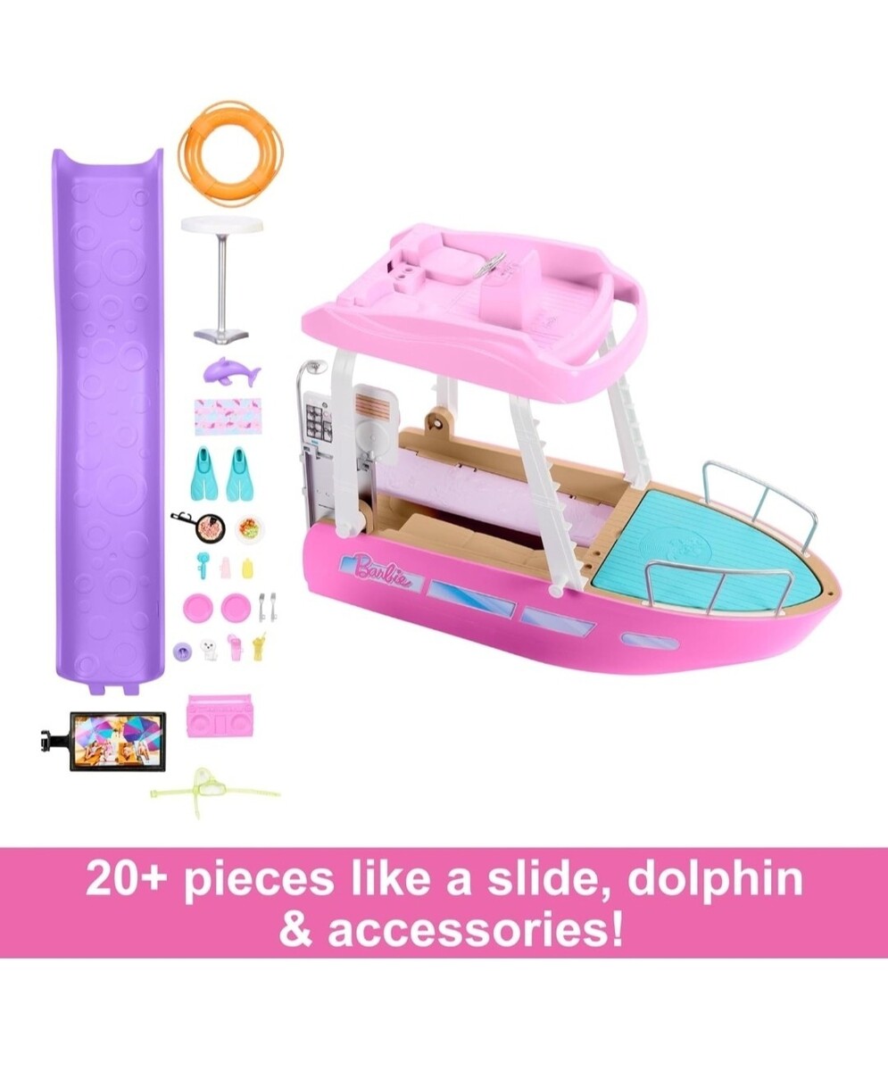 Have adventures on the high sea with this dreamy Barbie boat! With 20+ pieces and six different play areas, including a pool and slide, the Barbie Dream Boat playset is made for ocean-themed fun. Plus, at three feet wide and one foot tall, there is plenty of room for Barbie doll to invite her friends and have some fun in the sun! Doll not included. Colors and decorations may vary.
