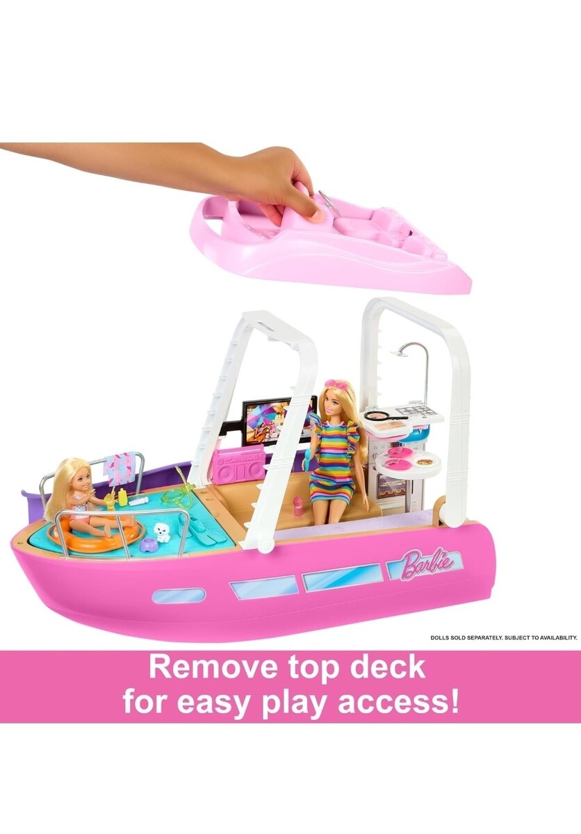 Barbie doll can climb to the top deck to steer the boat and relax in the sun, then slide down into the pool. Kids can even remove the top deck for easy play access. Doll not included.