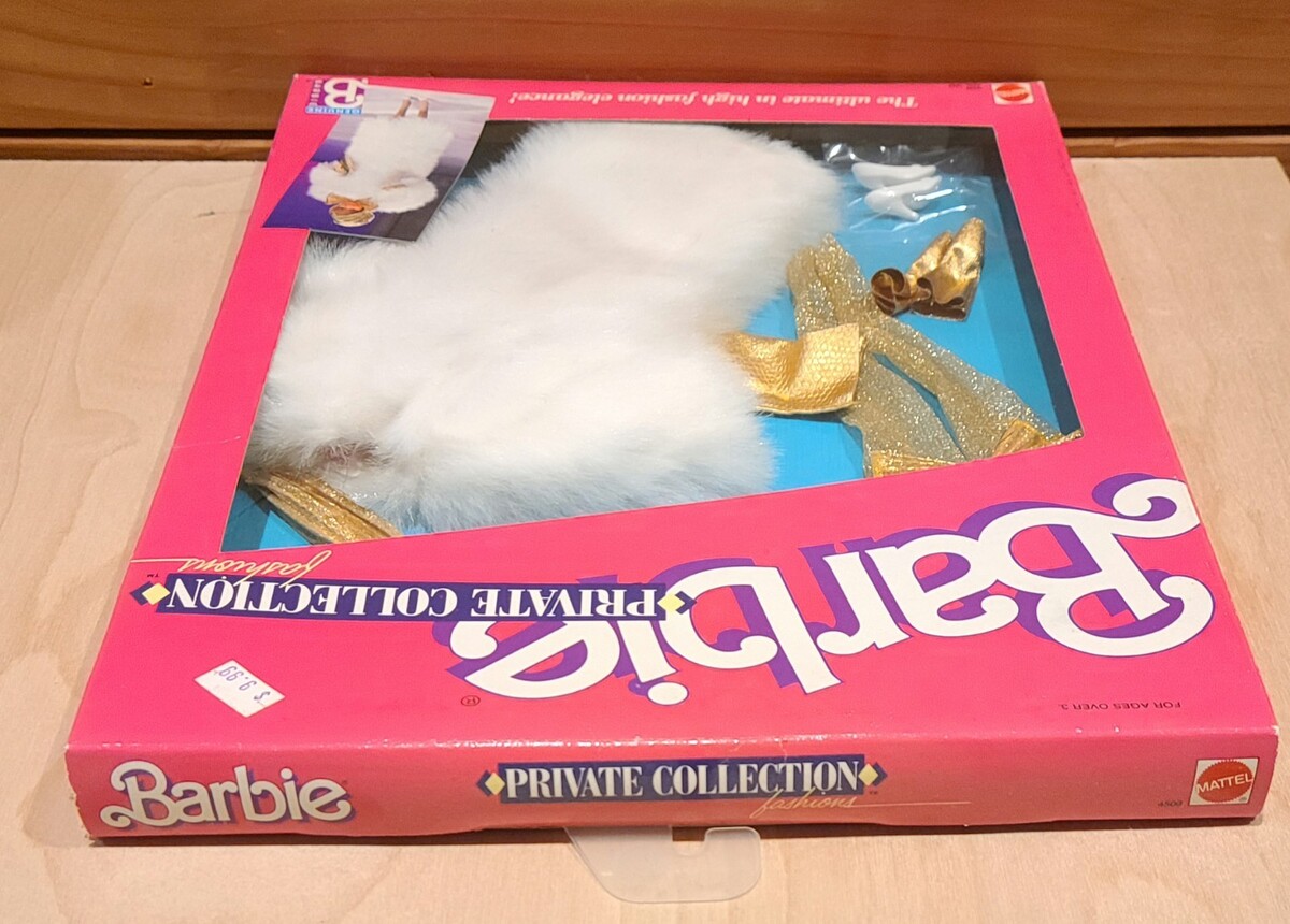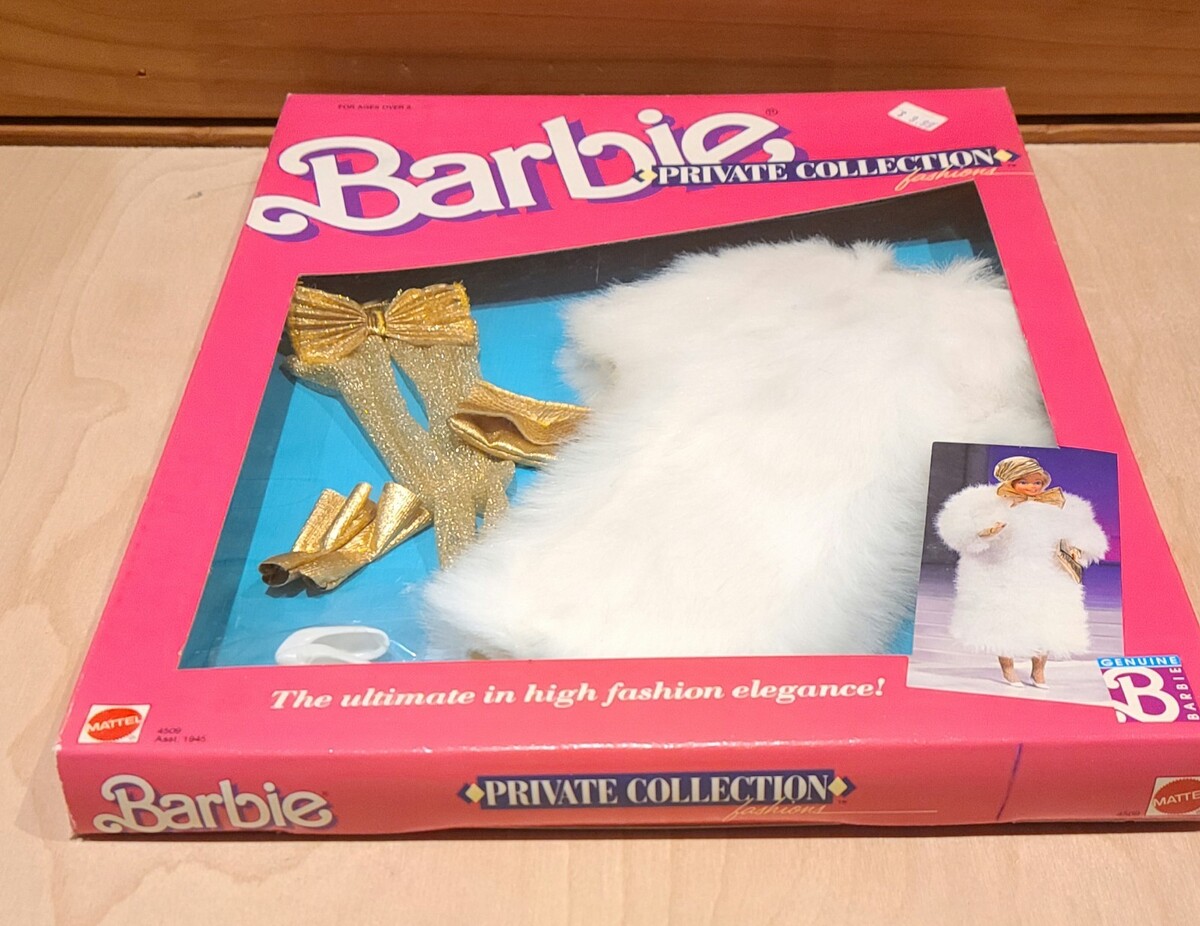 The Barbie Private Collection Fashion White Faux Fur Coat 4509 Accessories is a vintage doll clothing set from 1987, featuring a white and gold color scheme with a faux fur material. This set includes a coat/jacket, head wrap, and heels, perfect for a Barbie doll with a size of 11.5 inches. The clothing style is ideal for holiday, outerwear, seasonal, and special occasion themes, making it a charming addition to any Barbie collection. Made by Mattel under the Barbie franchise, this original set caters to adult collectors who appreciate vintage fashion and beauty.