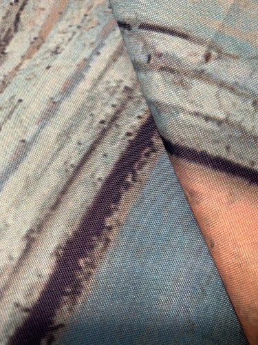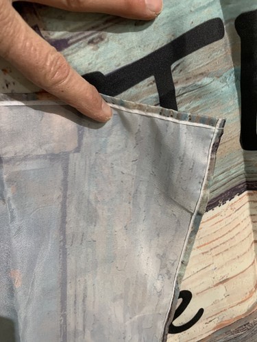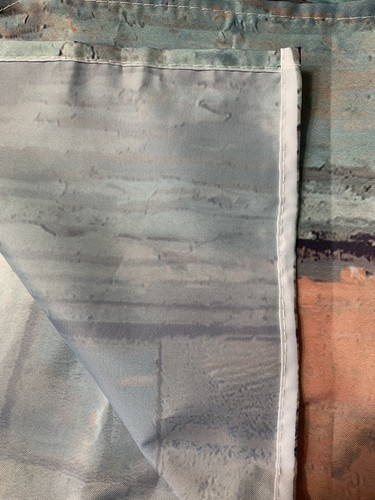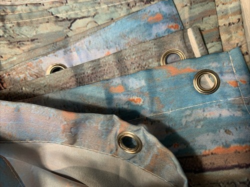 This is a lightweight, outer shower curtain, made of either polyester or nylon. Is not waterproof or light blocking. Could also be used as a wall hanging of sorts. Has gromets across the top for hanging. Measures approx 70" square. This is new, but does not have original packaging plastic sleeve. This is in new shape, lines on photos are shadows . . had to take photos where lighting was not the greatest.