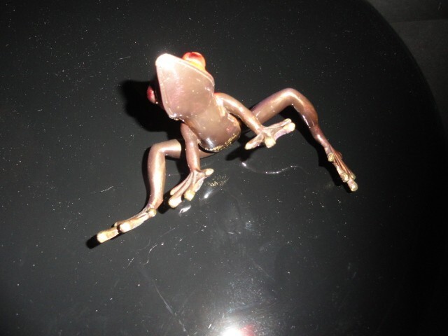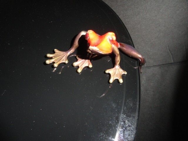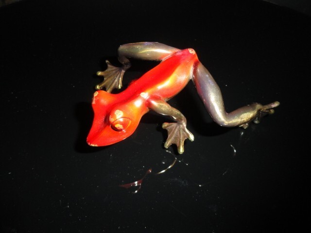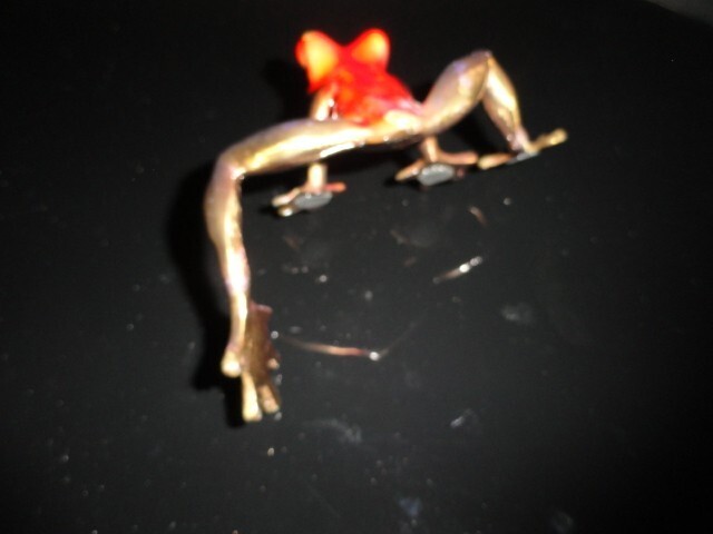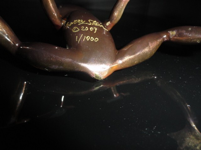 The Barry Stein Bronze Frog is a intricately crafted figurine made of bronze, showcasing a realistic representation of a frog. This collectible piece showcases the detailed craftsmanship of the artist and captures the essence of the amphibian beautifully. Perfect for collectors or animal enthusiasts, this figurine adds a touch of nature and elegance to any space.