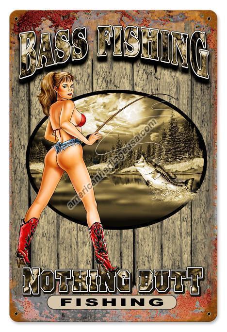Bass Fishing-Nothing Butt Pin-Up Vintage Metal Sign measures 12 inches by 18 inches and weighs in at 2 lb(s).