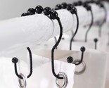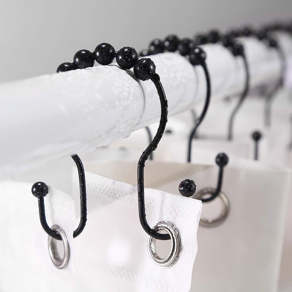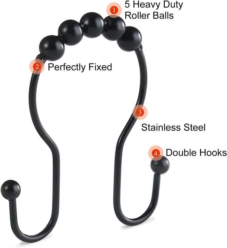[DOUBLE SHOWER HOOKS]: The black shower curtain hooks are made by exquisite craft. The obstacle on both sides fix the rollwer balls to keep balance, which prevent shower curtain from falling off, it's strong enough to hold both heavy curtain and liner.