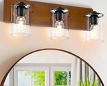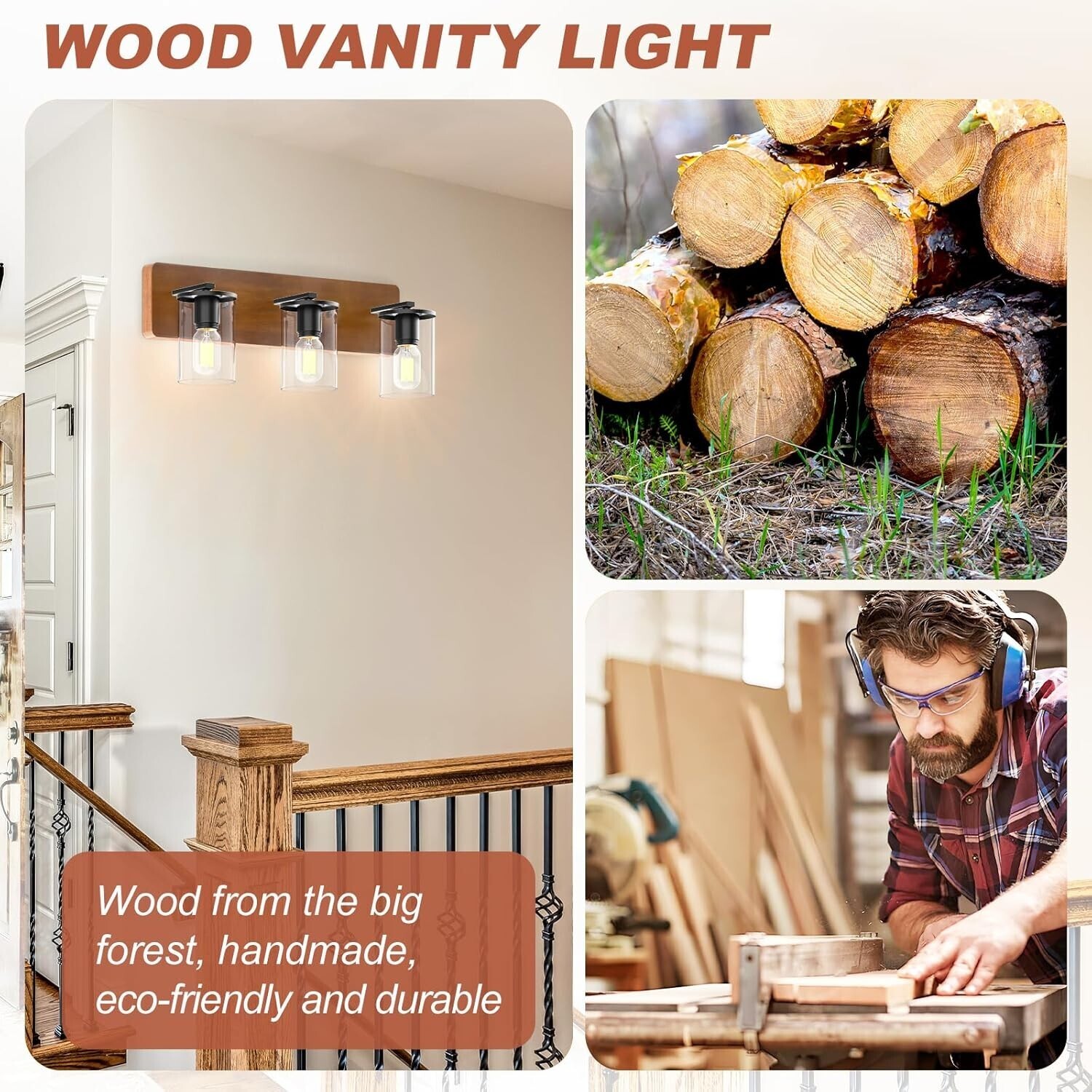 Bathroom Vanity Light Fixtures, Modern Wall Light with Clear Glass Shade Natural Wood Vanity Light Panel, Bathroom Light Fixtures (3 Lights)