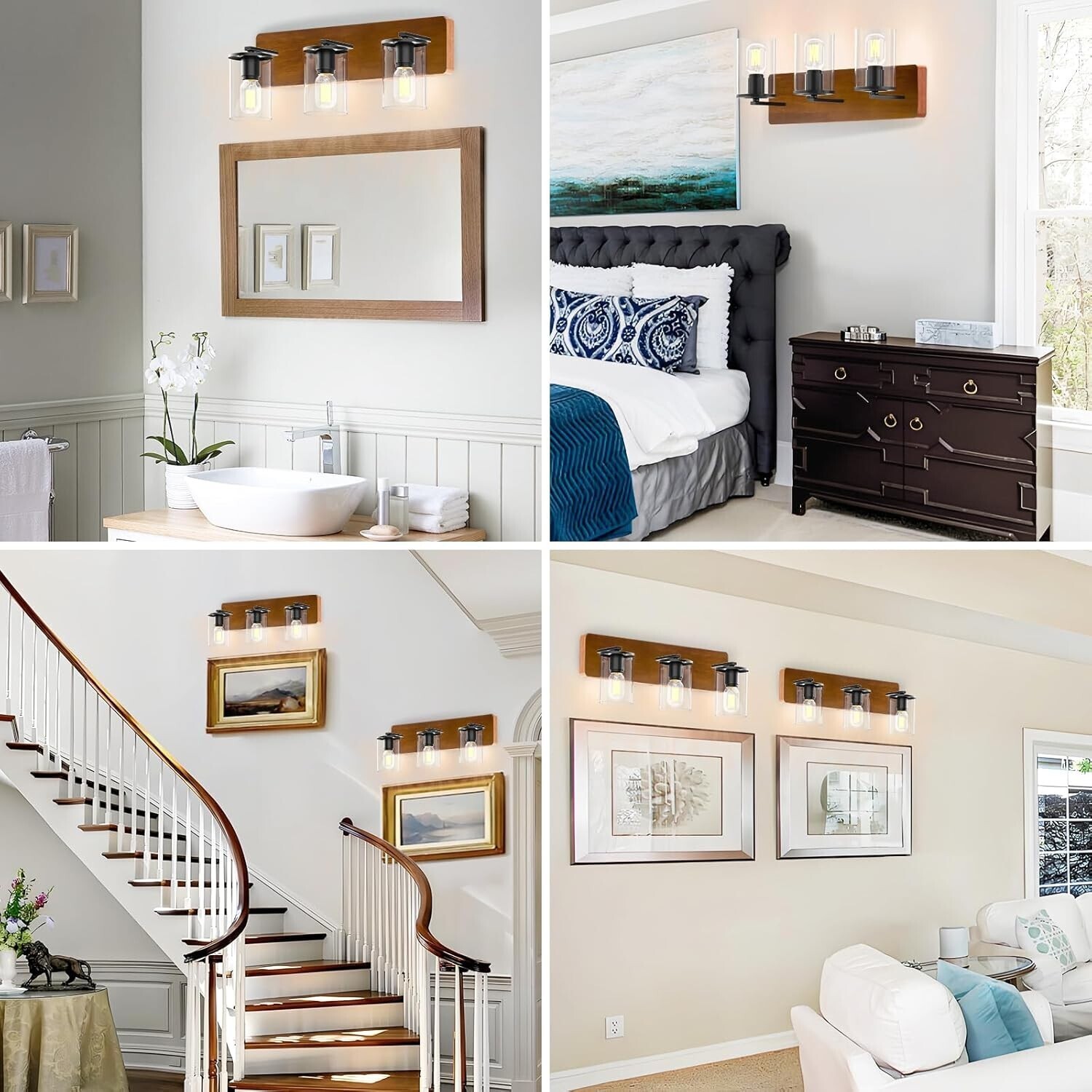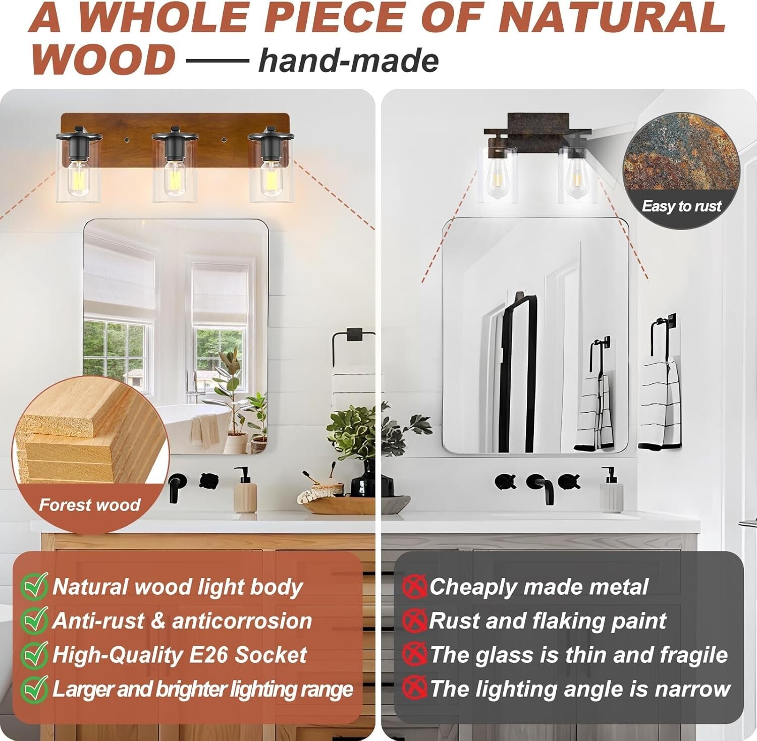 ?Unique Design Premium Quality Wood Vanity Lights?Bathroom vanity light crafted with pure natural rubber wood frame and thicker third-generation high-transparency glass lampshade, these bathroom light fixtures maintain brightness even in humid environments like bathrooms. With a distinctive natural rubber wood rectangular large back plate and stylish appearance, this vanity light is perfect for various spaces such as bathroom vanity lights, bedrooms, doorways, or entrances. Its durability and style make it an ideal choice for illuminating your home.