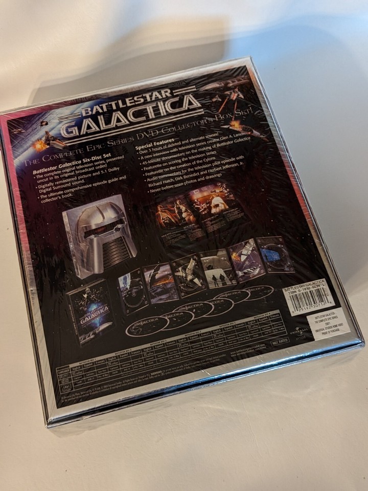 Up zum Verkauf ist eine neue, versiegelte DVD -Kopie der Battlestar Galactica Complete -Serie mit 24 Folgen auf 6 Discs.