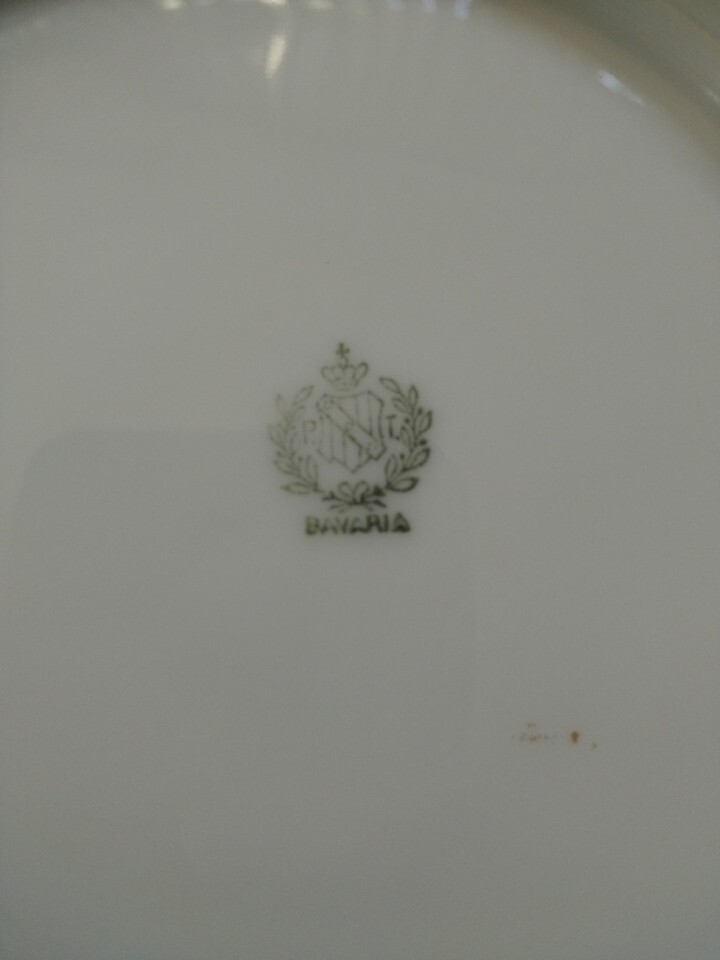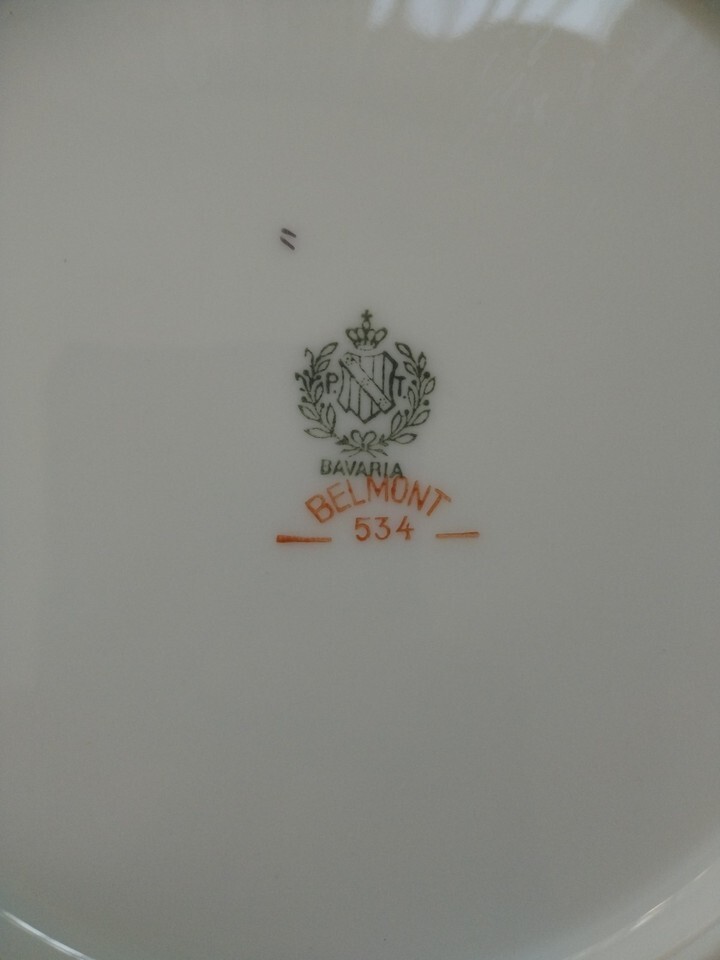 The Bavaria Belmont 534 handpainted deco china set includes 4 cups and 3 bowls in a vintage gold green color scheme. This set is crafted in Bavaria and features a painted backstamp, adding to its authentic charm. Perfect for adding a touch of elegance to any table setting, this set is a beautiful and unique addition to any pottery and glass collection.