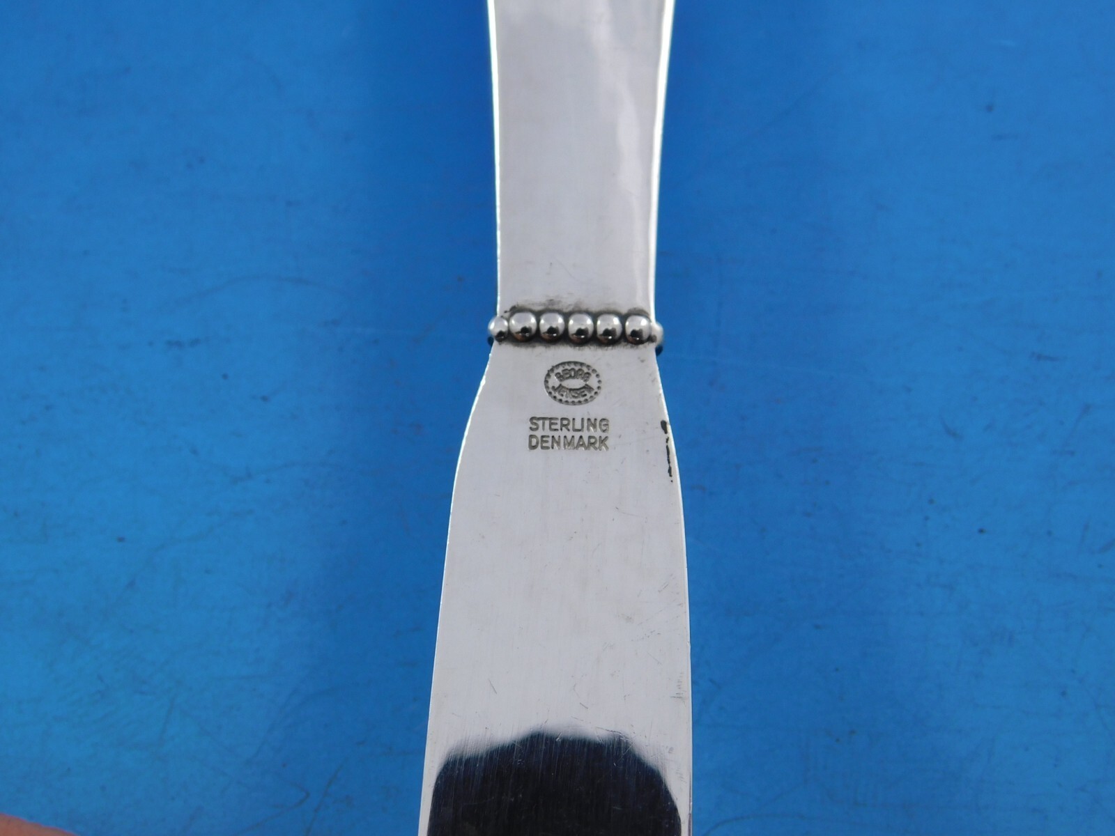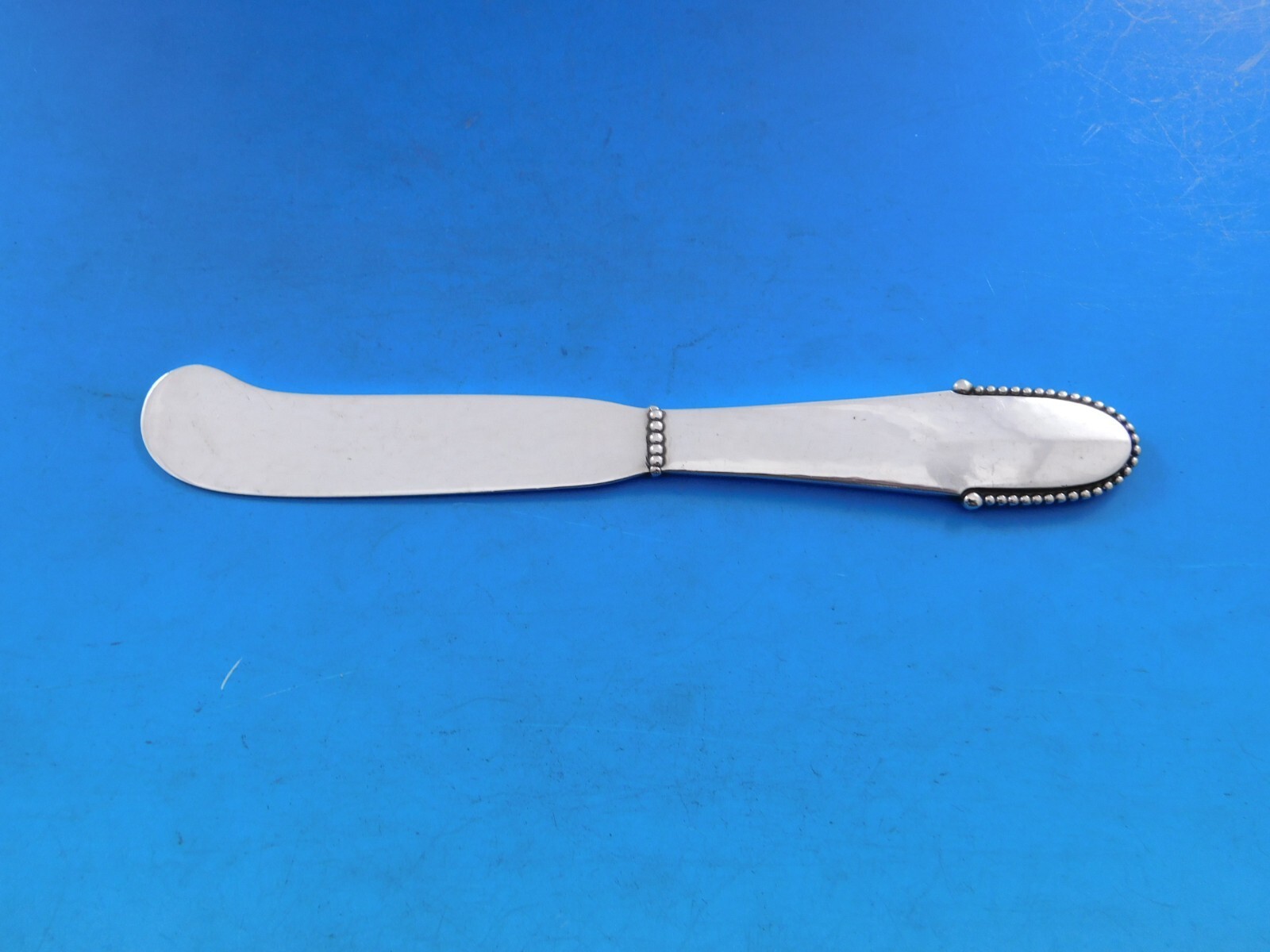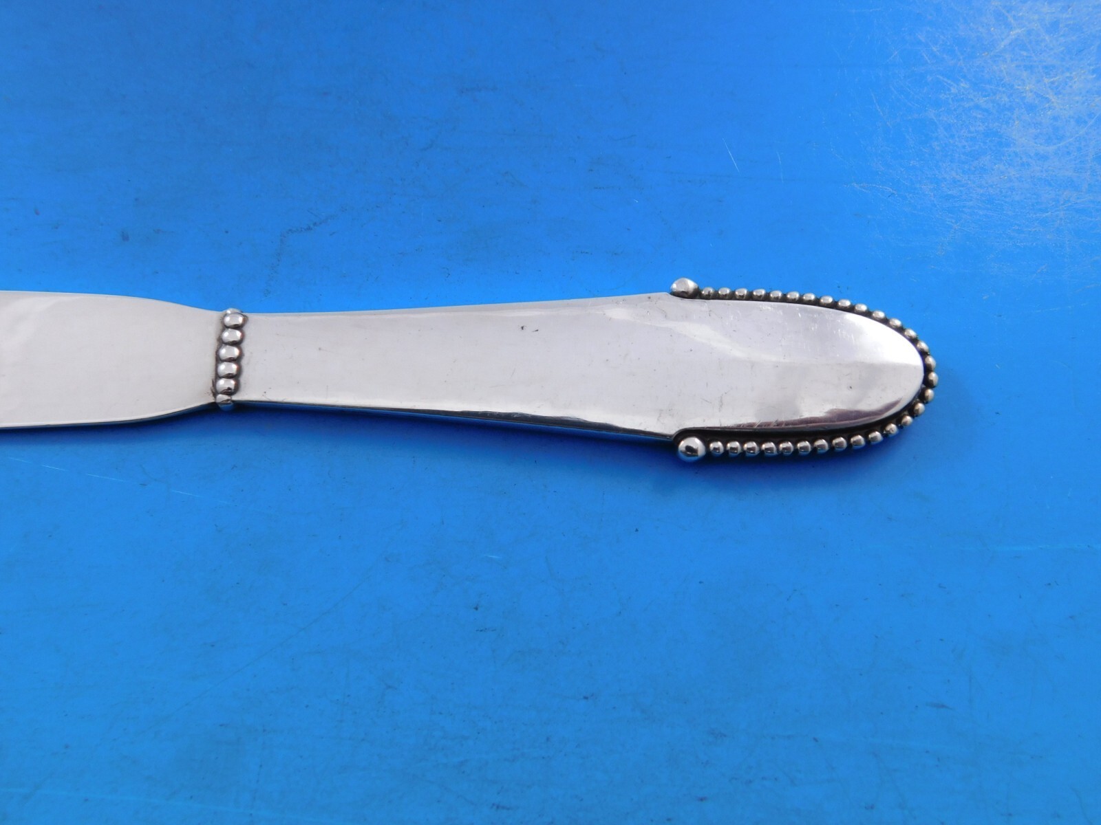 Set of 12 sterling silver hollow handle all sterling Butter Spreaders with stainless paddle blades, 5 7/8", in the pattern Beaded by Georg Jensen. They are not monogrammed and are in excellent condition.