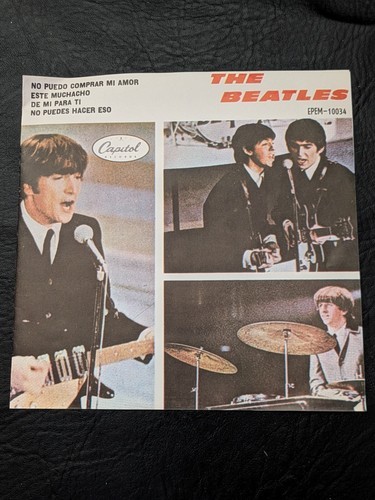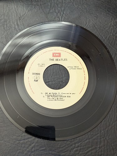 Questo EP da 7 pollici Beatles, pubblicato nel 1981, presenta quattro canzoni in eccellente qualita del suono. La classificazione dei record e elencata come eccellente (Ex) e la classificazione delle maniche e molto buona Plus (VG+). L'EP e disponibile in una manica di carta ed e di colore nero. Le canzoni sono in stile invasione britannico e includono generi di vecchietti. L'anno di rilascio e del 1981 e l'etichetta discografica e EMI. Questo EP e un must per qualsiasi collettore di record in vinile o fan dei Beatles. Canzoni inclusi: Nessun PUEDO COMPRA MI AMOR Este Muchacho De mi para ti Nessun PUEDES Hacer ESO