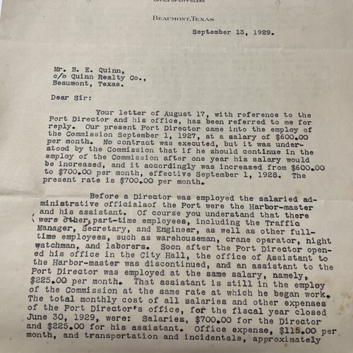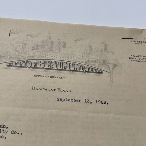 - Beaumont Texas Letter 1929 City clerk To State Representative