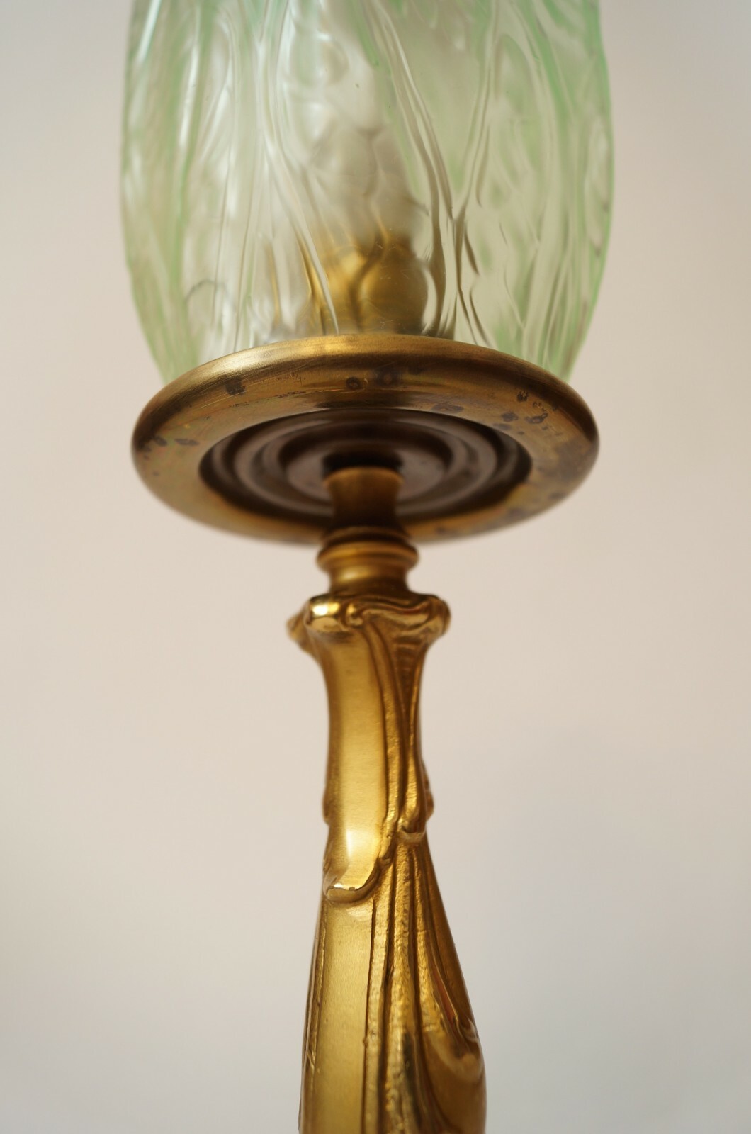 Beautiful unique from our lighting factory - only available here. Delicate classic Art Nouveau brass cast gear with subtle patina, approx. 1950s. Very rare, antique original Art Deco Glass, Lindgrün, satin, approx. 1920s. Total height approx. 33 cm, shade diameter approx. 10cm. Completely new electrical installation. PVC supply cable with cord intermediate switch. Antique E27 brass socket, up to max. 60 watts - we strongly recommend LED bulbs! Small parts such as screws and washers were replaced. Sale without decorations and lamps! Free shipping within Germany!