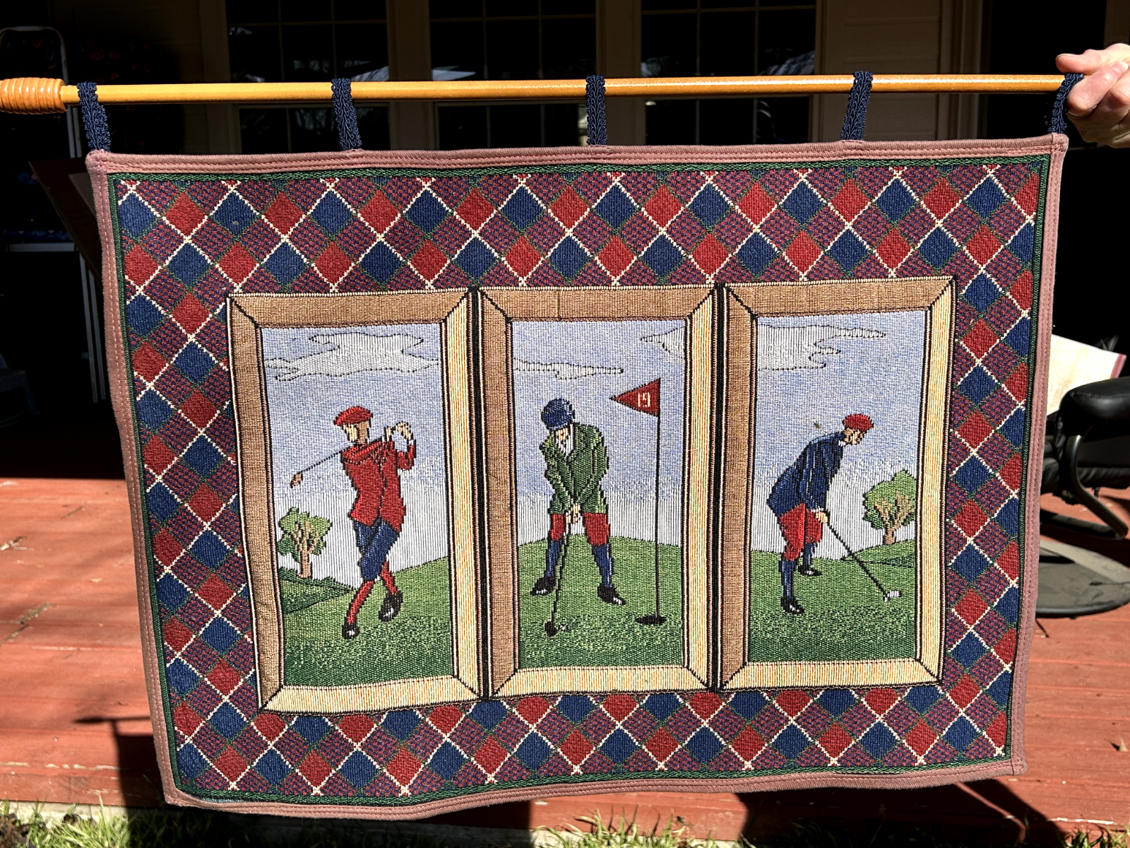 Beautiful Golf Wall Hanging Tapesty 3 golfers in knockers - 19.5" x 27.5" plus hanging rod