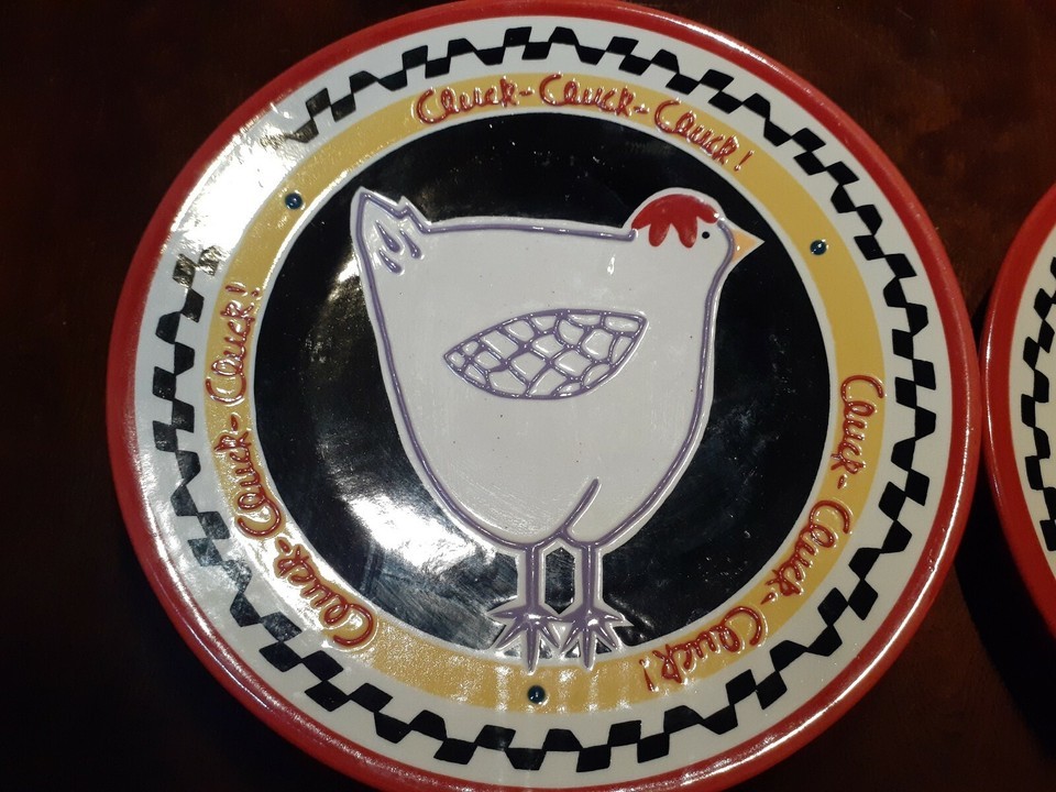 Becky Denny Cluck,Cluck,Cluck, 12" Round Chicken Platter Serving Dishes(2)Plates. Condition is Used. Shipped with USPS Priority Mail.