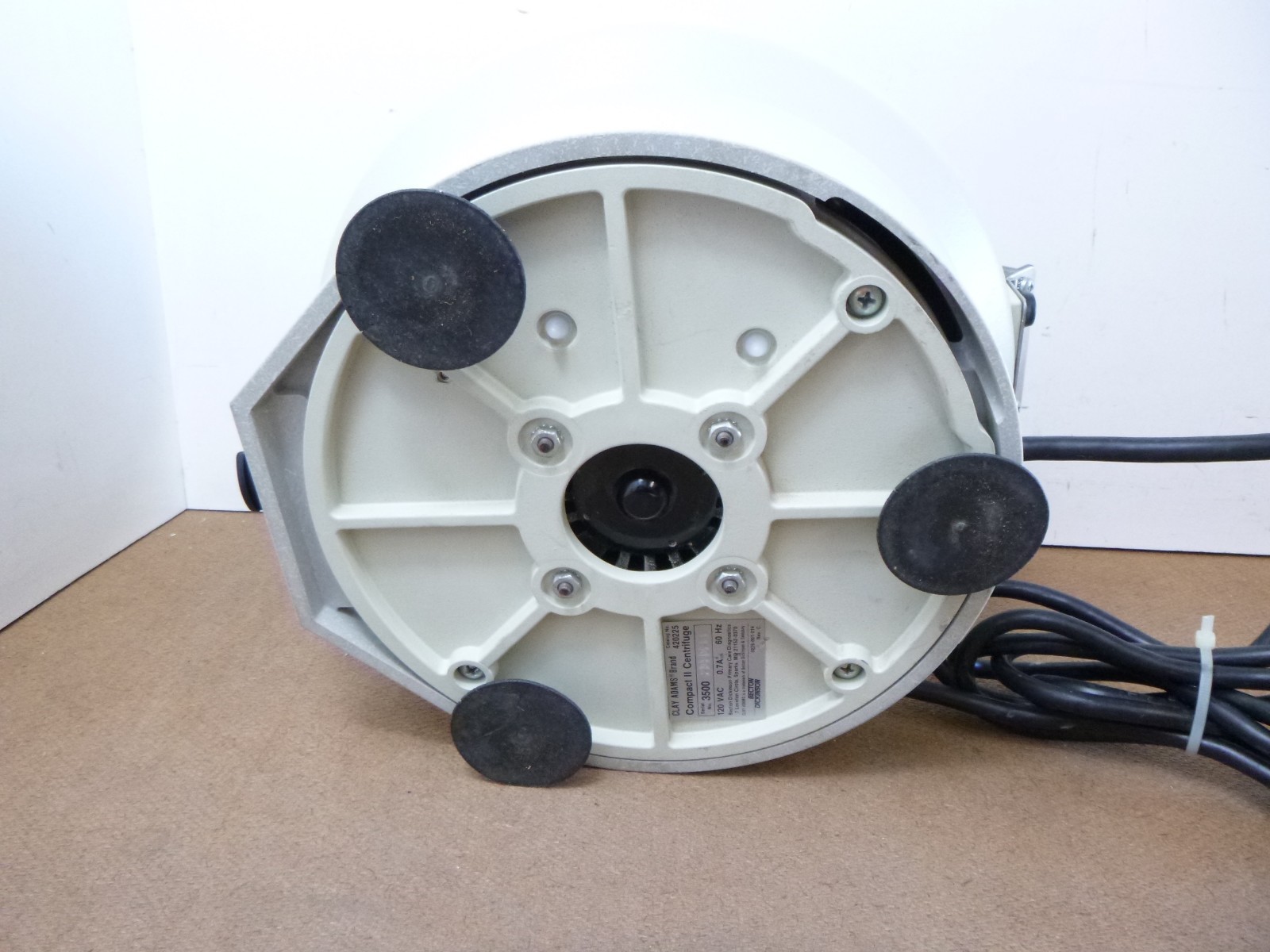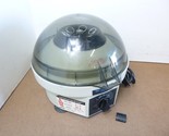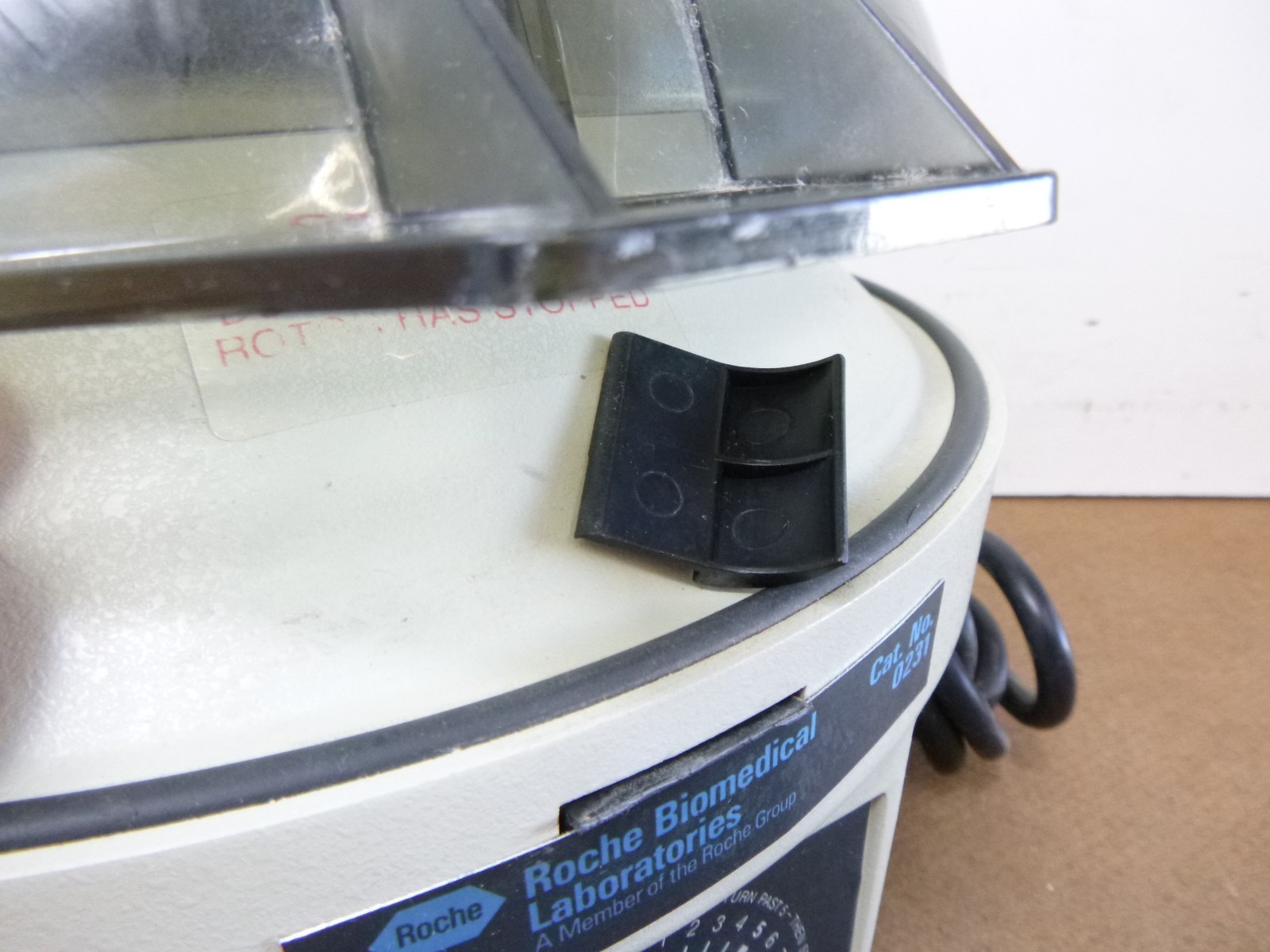 This centrifuge powers on and runs smoothly. The plastic lid latch has broken off but the centrifuge still functions fine.