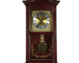 The Bedford Clock Collection 22 Inch Wall Clock features a mahogany cherry oak finish case. Rich and deeply colored it's timeless, exquisite, and classic addition to any office or home wall. The dial is bright and perfectly brings forward the roman numerals for your viewing ease. An enclosed pendulum is framed with delicate design elements in front. Enjoy the tune of four different hourly chimes that have a volume control toggle.
