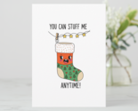 Add some playful humor to the festive season with this hilarious 'You Can Stuff Me Anytime!' stocking greeting card! Featuring an adorable, blushing stocking cartoon hanging on a string of lights, this card is perfect for adults with a sense of humor. Ideal for your partner, spouse, exchange, or a fun holiday surprise for friends. Made from premium cardstock, this quirky and memorable card is sure to bring a laugh and light up the holidays. Get yours today for a uniquely naughty greeting!